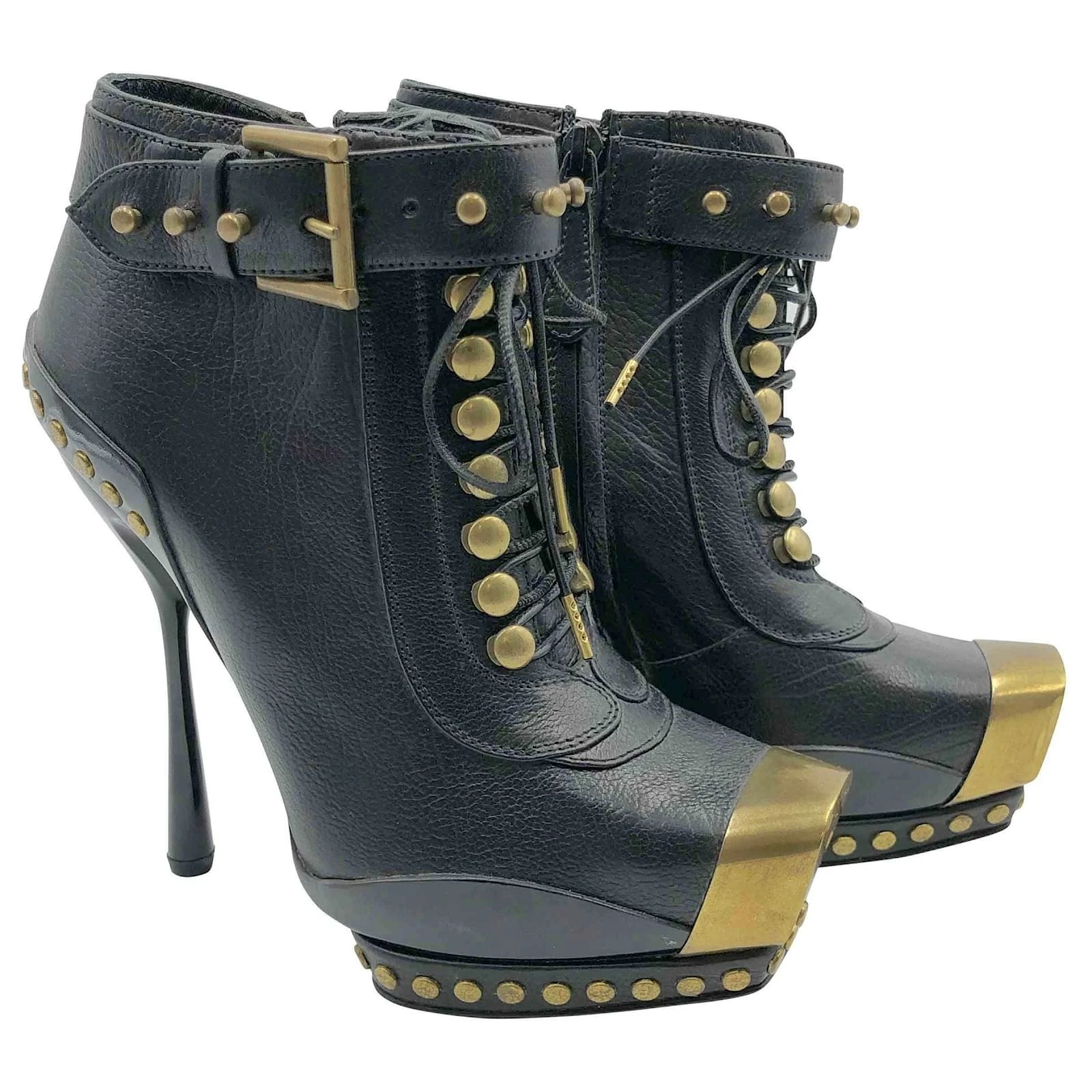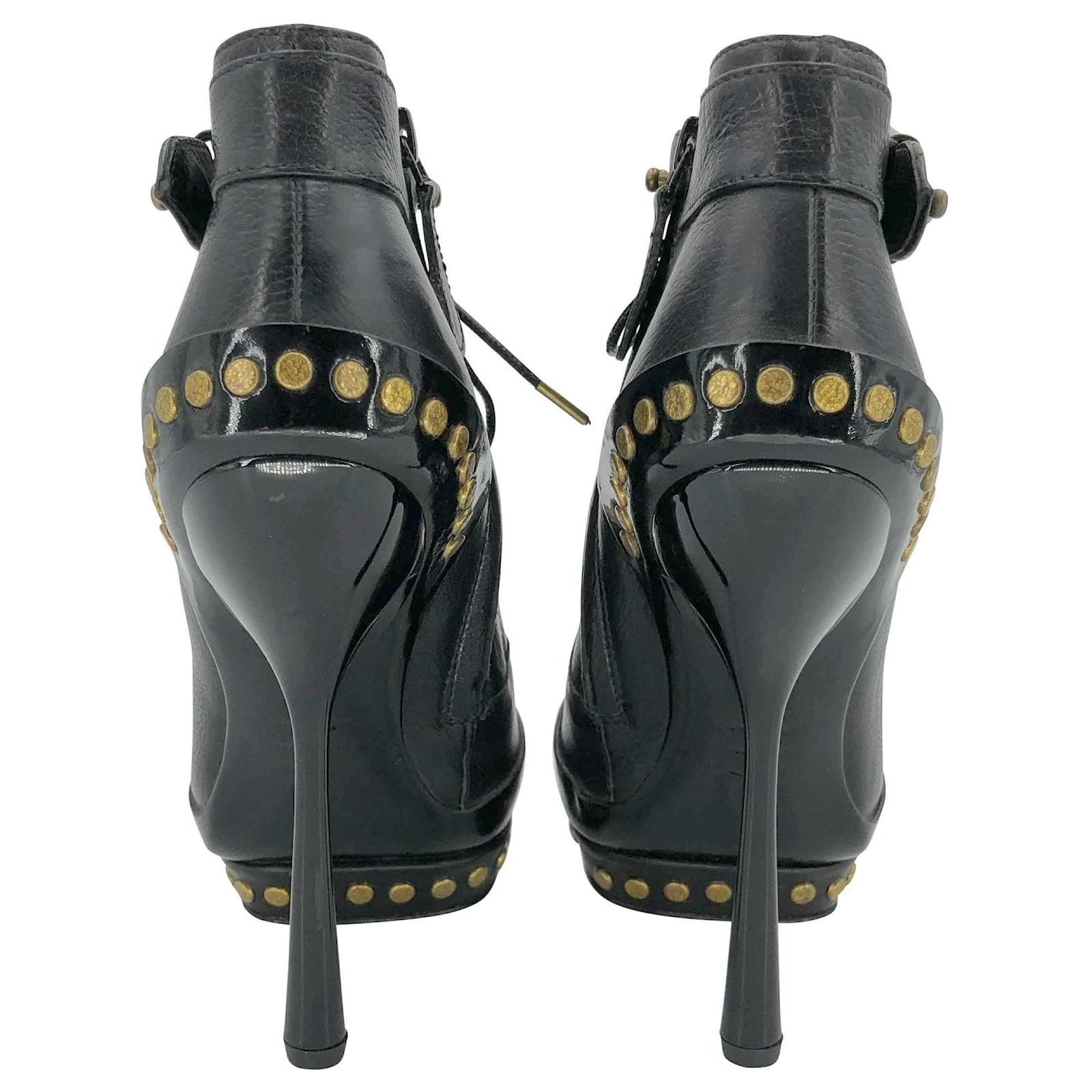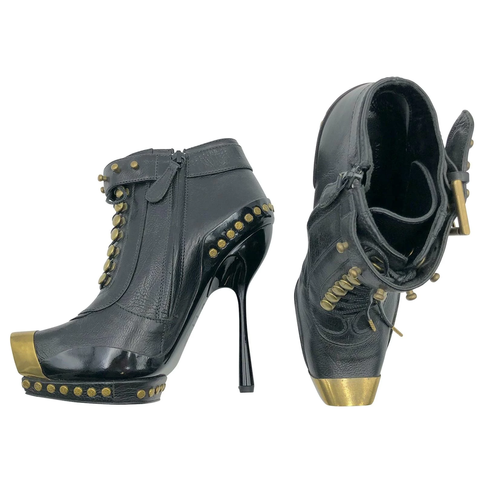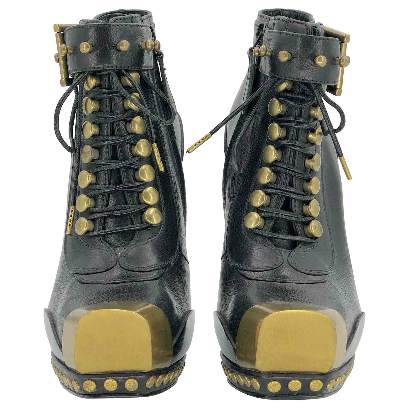 Size 36 EUCollector’s item.Shop these iconic ankle boots from Alexander McQueen from 2011.Featuring gold stud detailing, these shoes have been crafted in black leather.These high heels also have a platform to elongate your frame.They also have gold-tone metal toe-caps and square toes.Heel Height: 10cm.Heel height from ground: 14cm.