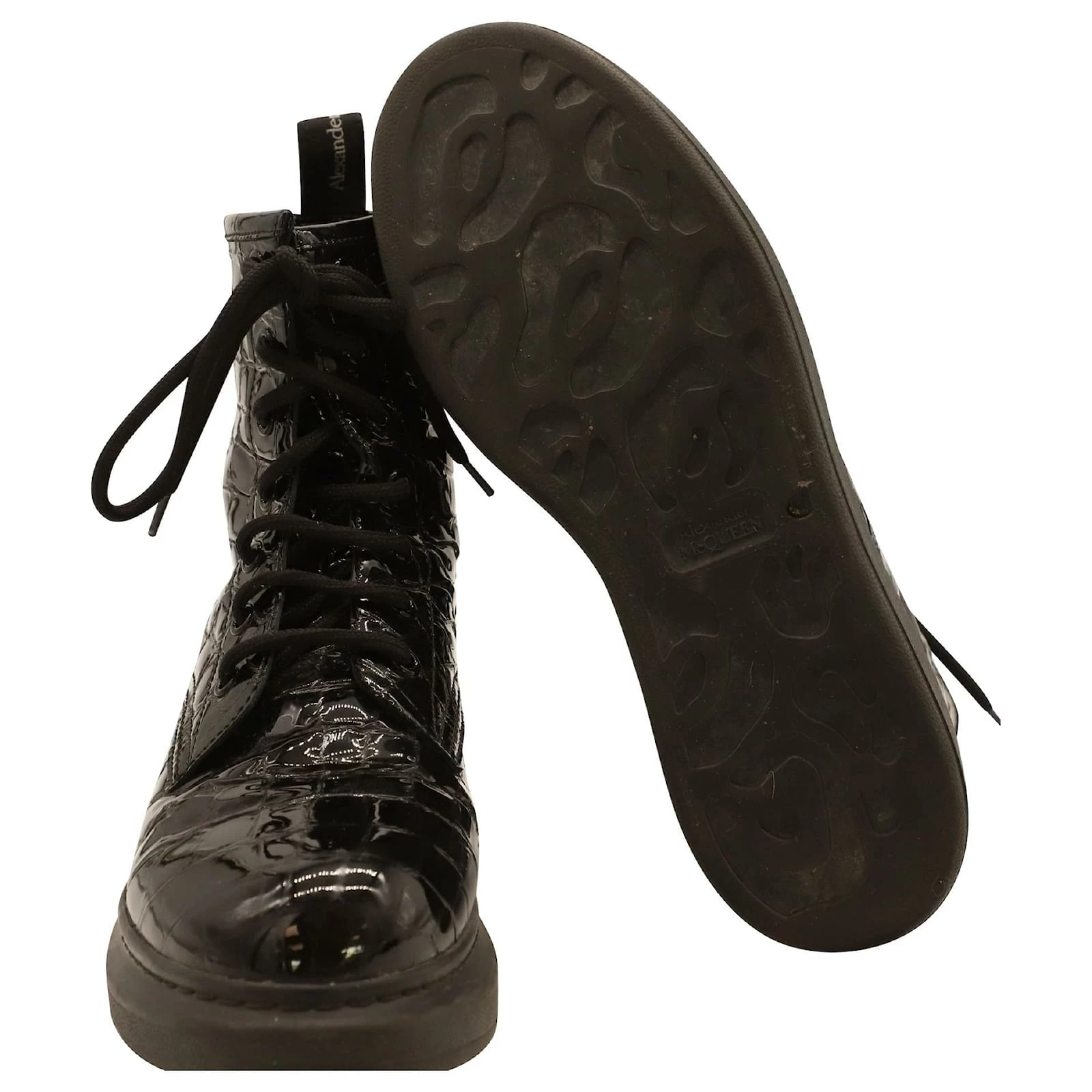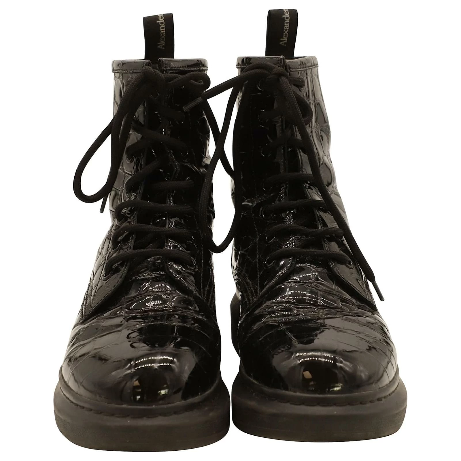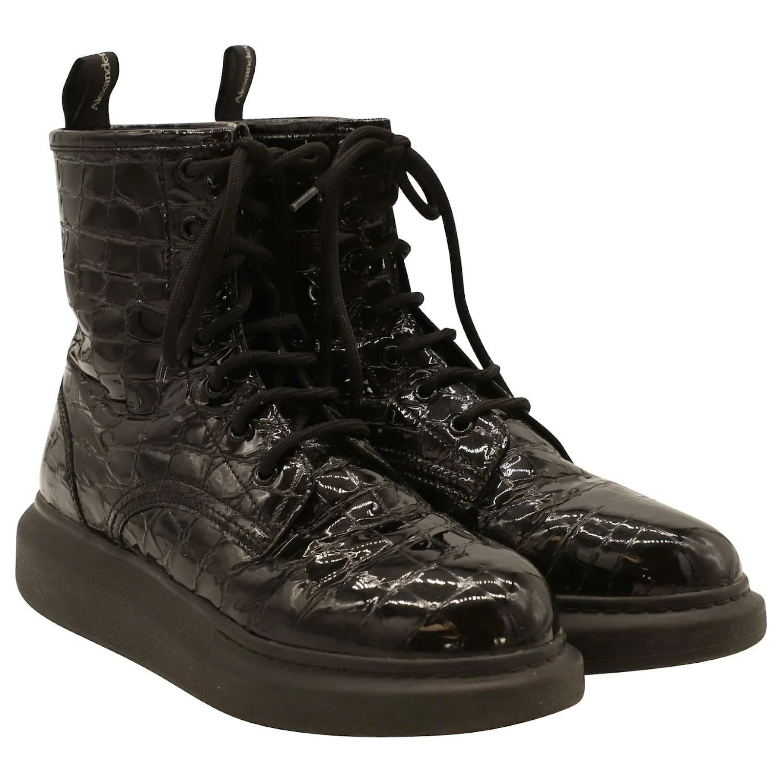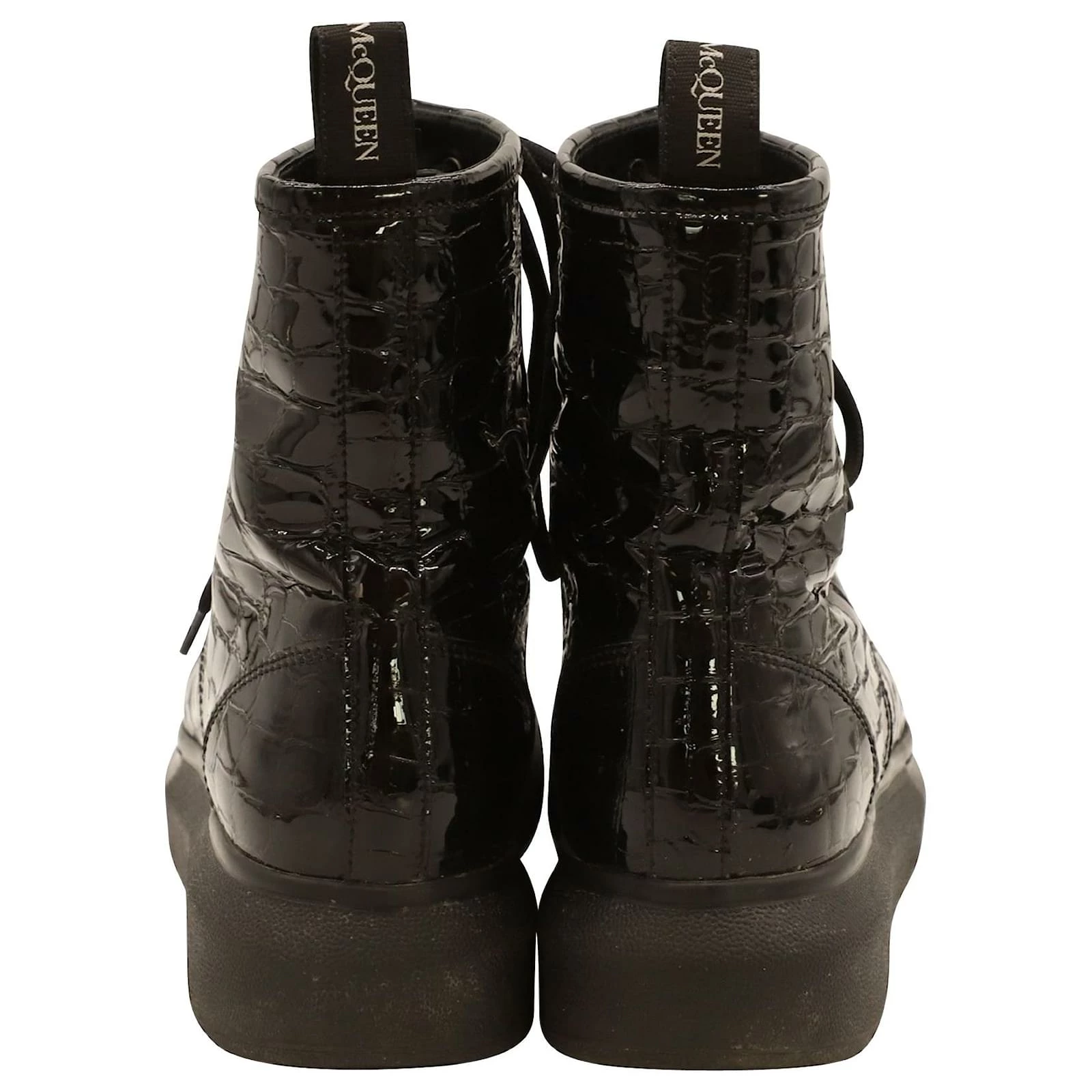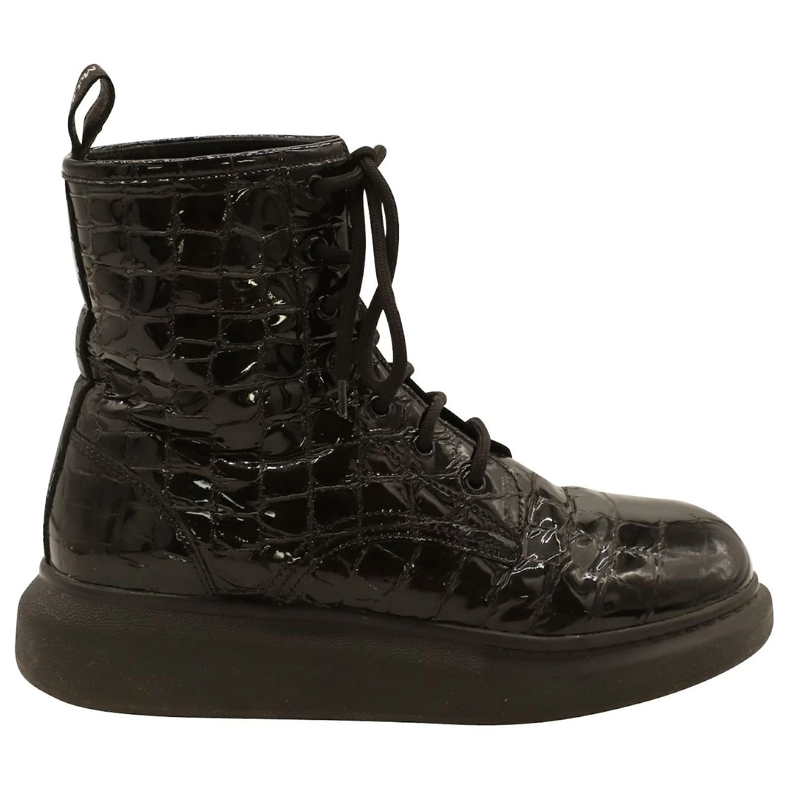 Alexander Mcqueen Chunky Sole Croc-Effect Ankle Boots In Black Patent Leather