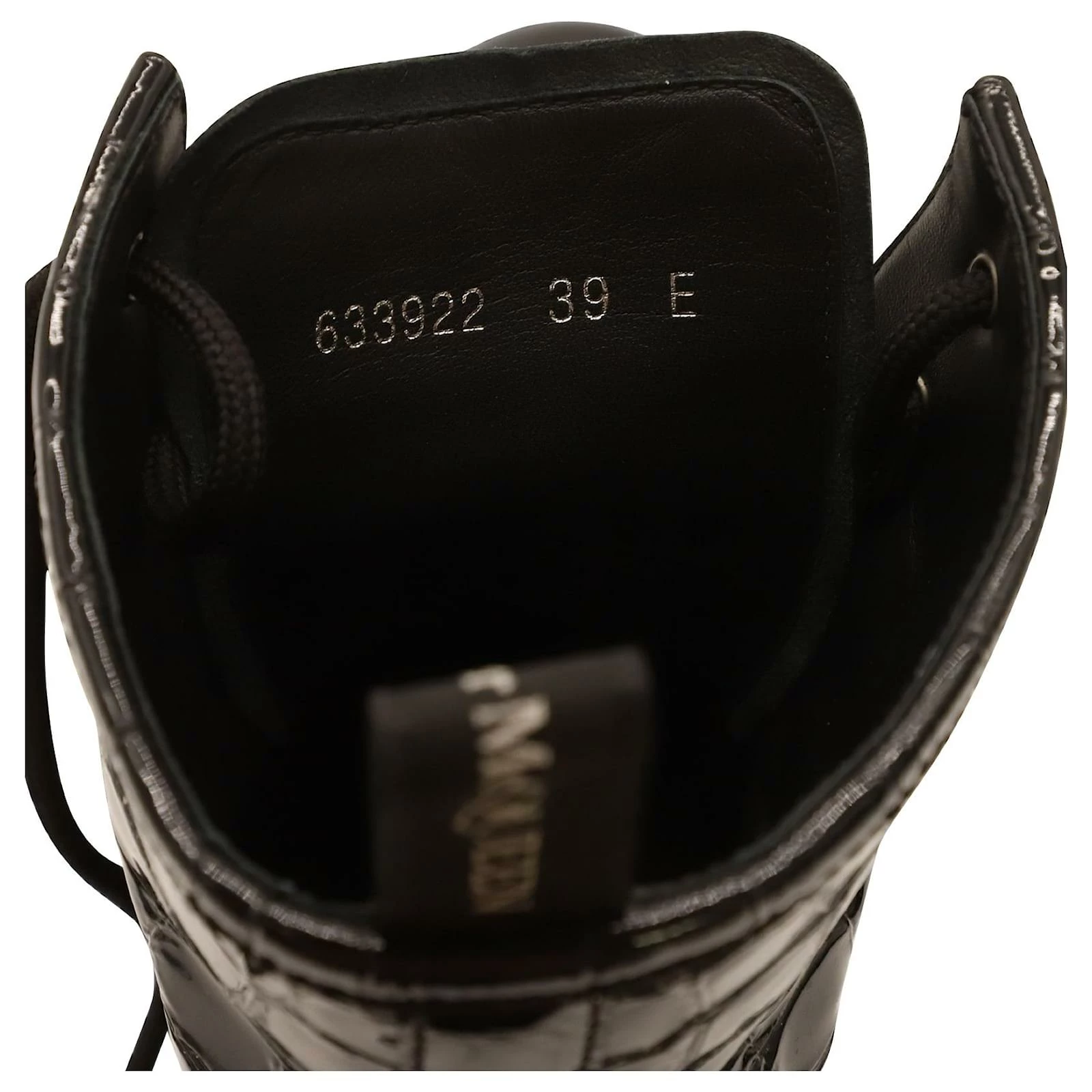 Alexander Mcqueen elevates your style quotient giving you just the right amount of attention with this gorgeous pair of croc-effect black boots. These luxurious leather boots make for comfortable wear. They are styled in a chunky silhouette with round toes, lace ups and robust rubber soles. Grab them right away!