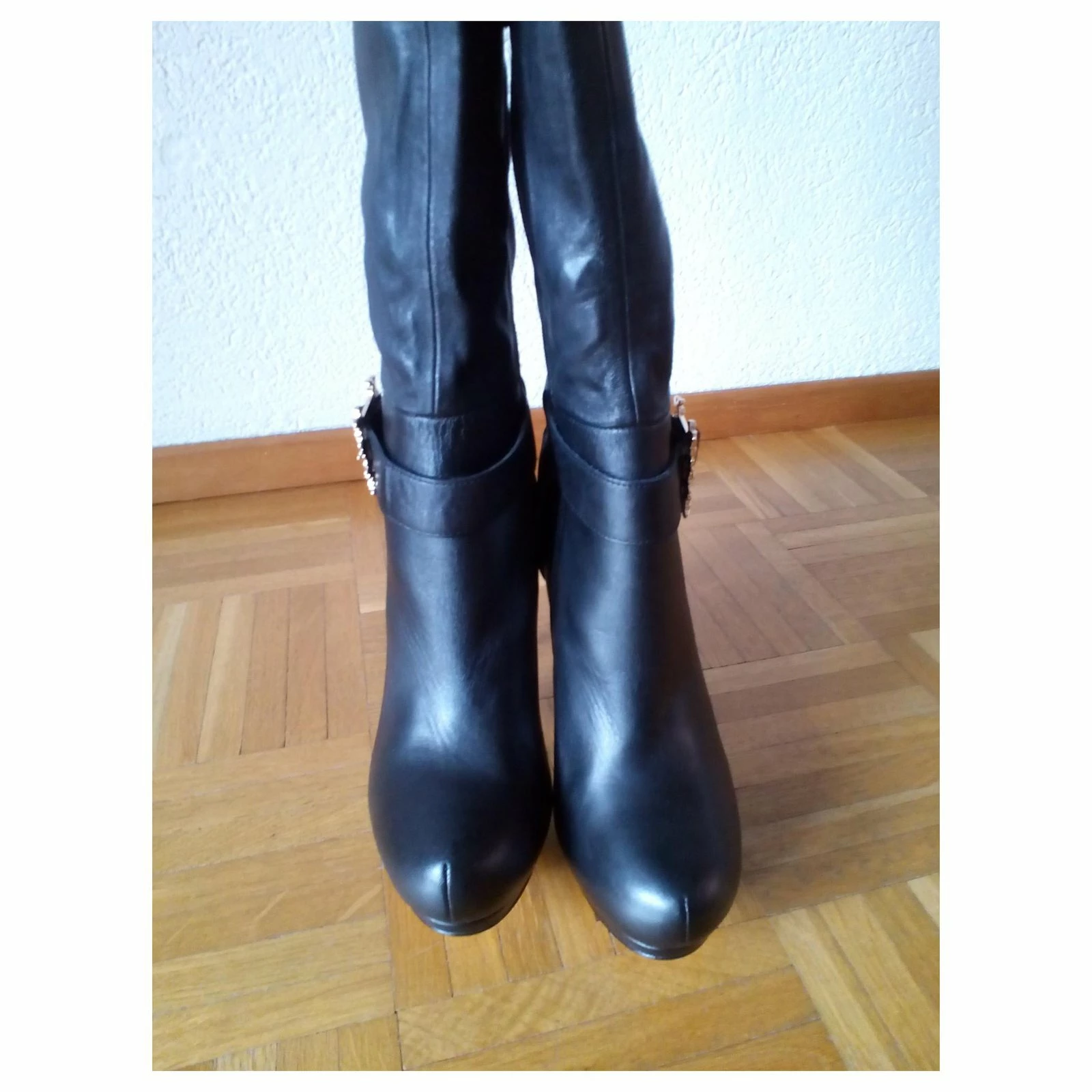 ANNA DELLO RUSSO per H&M Black leather high boots with platform and high heels. Horse buckle fastening in Gold metal; pull on side zip 100% Leather books.