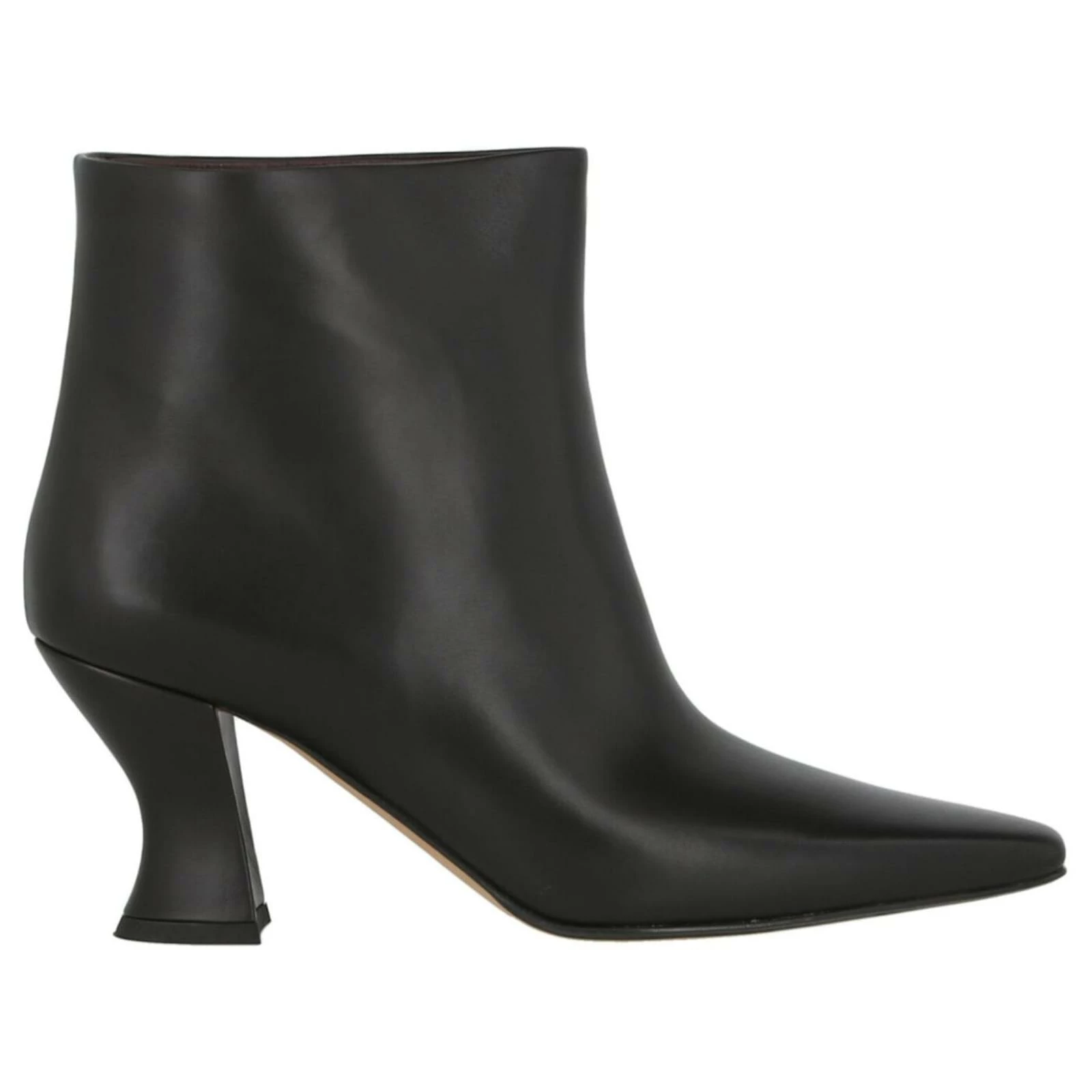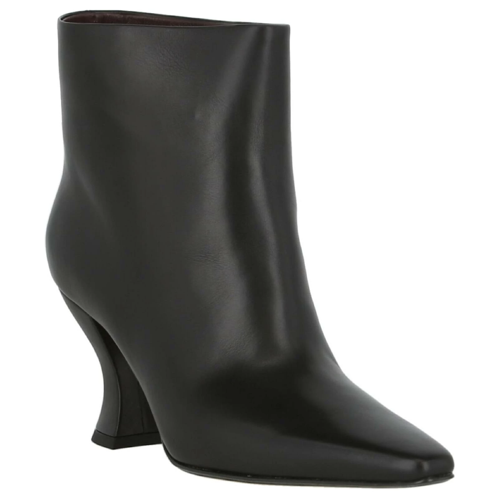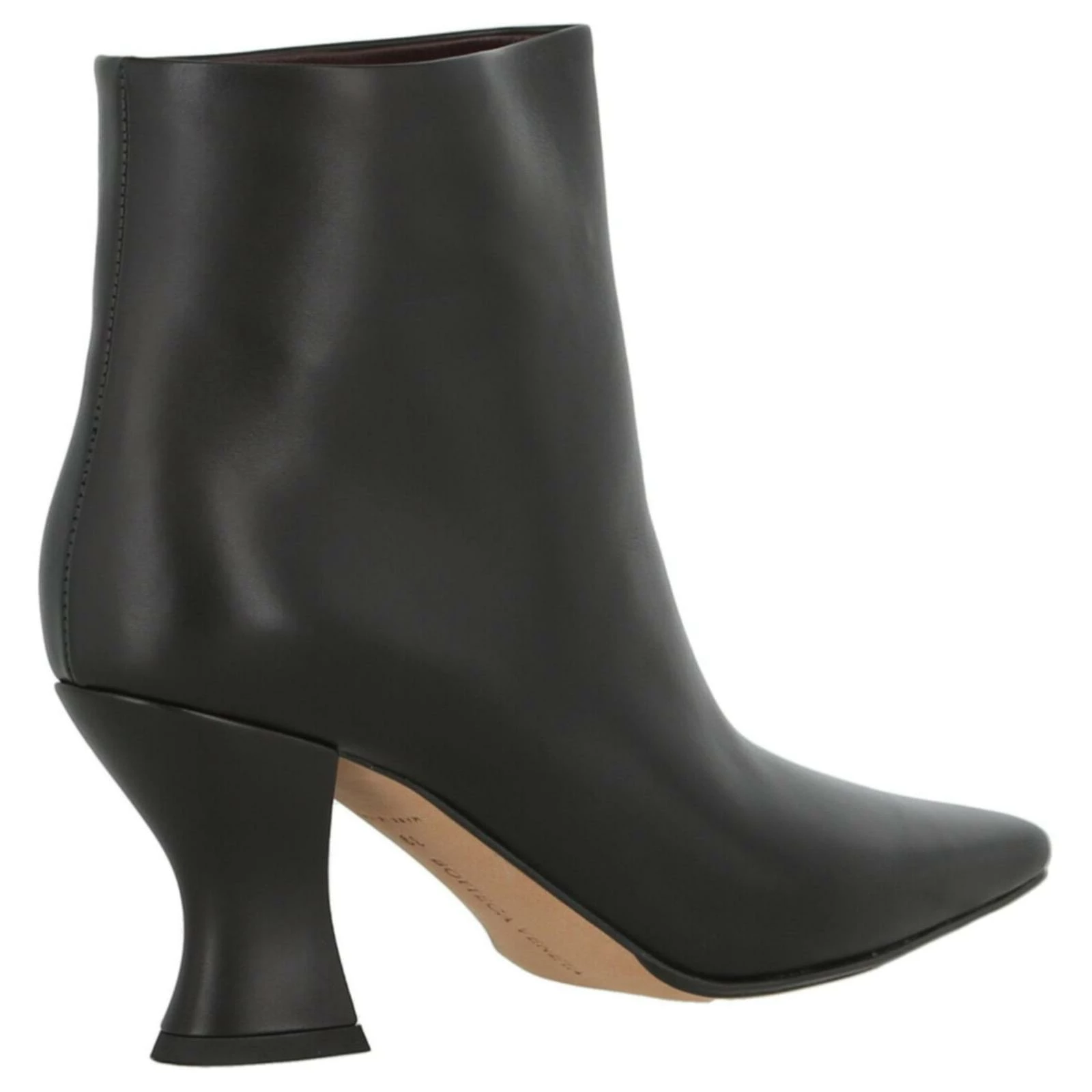 Heel measures at approximately: 2.75″; Slips on; 100% Lambskin Leather; Pointed closed toe, ankle length, curved block heel; ;