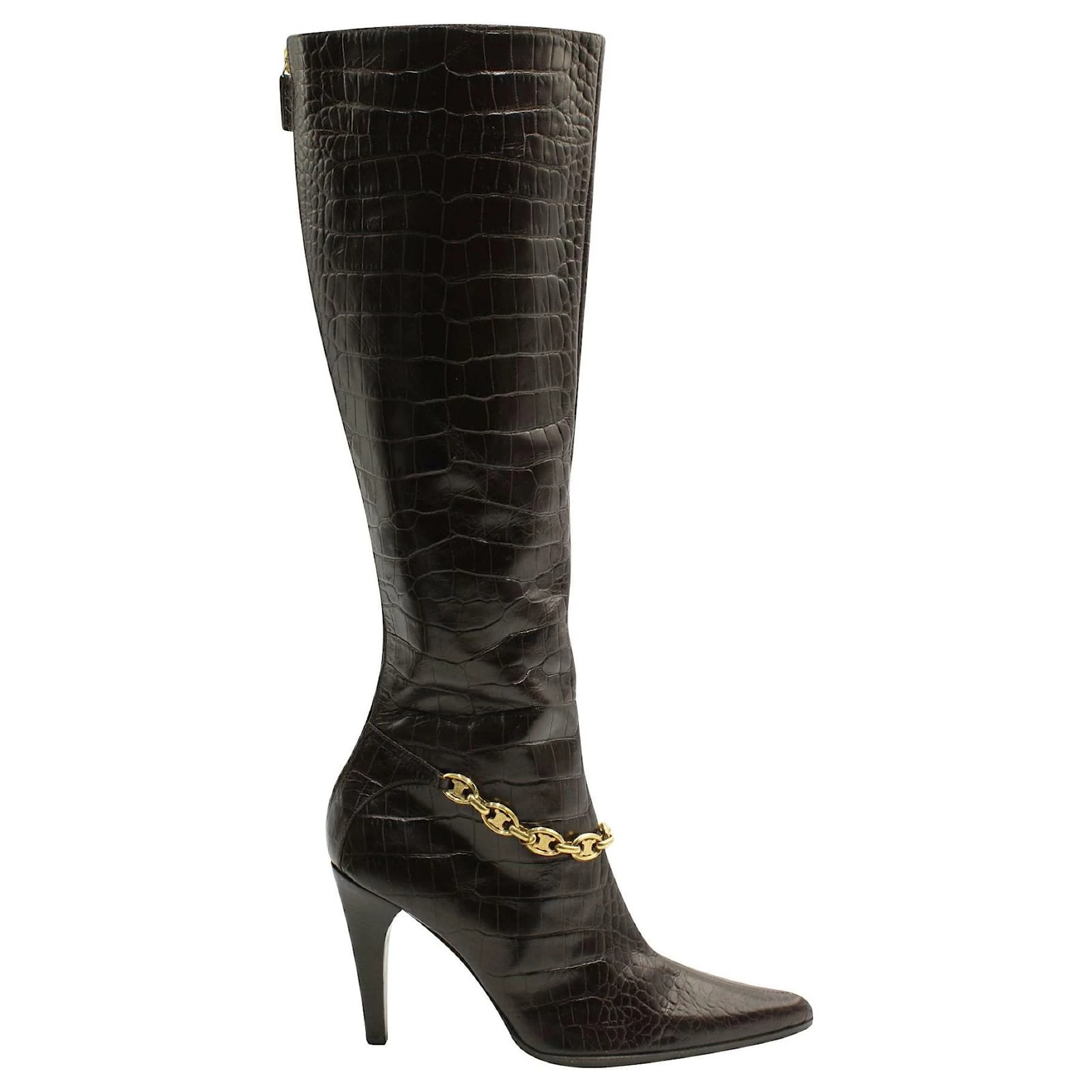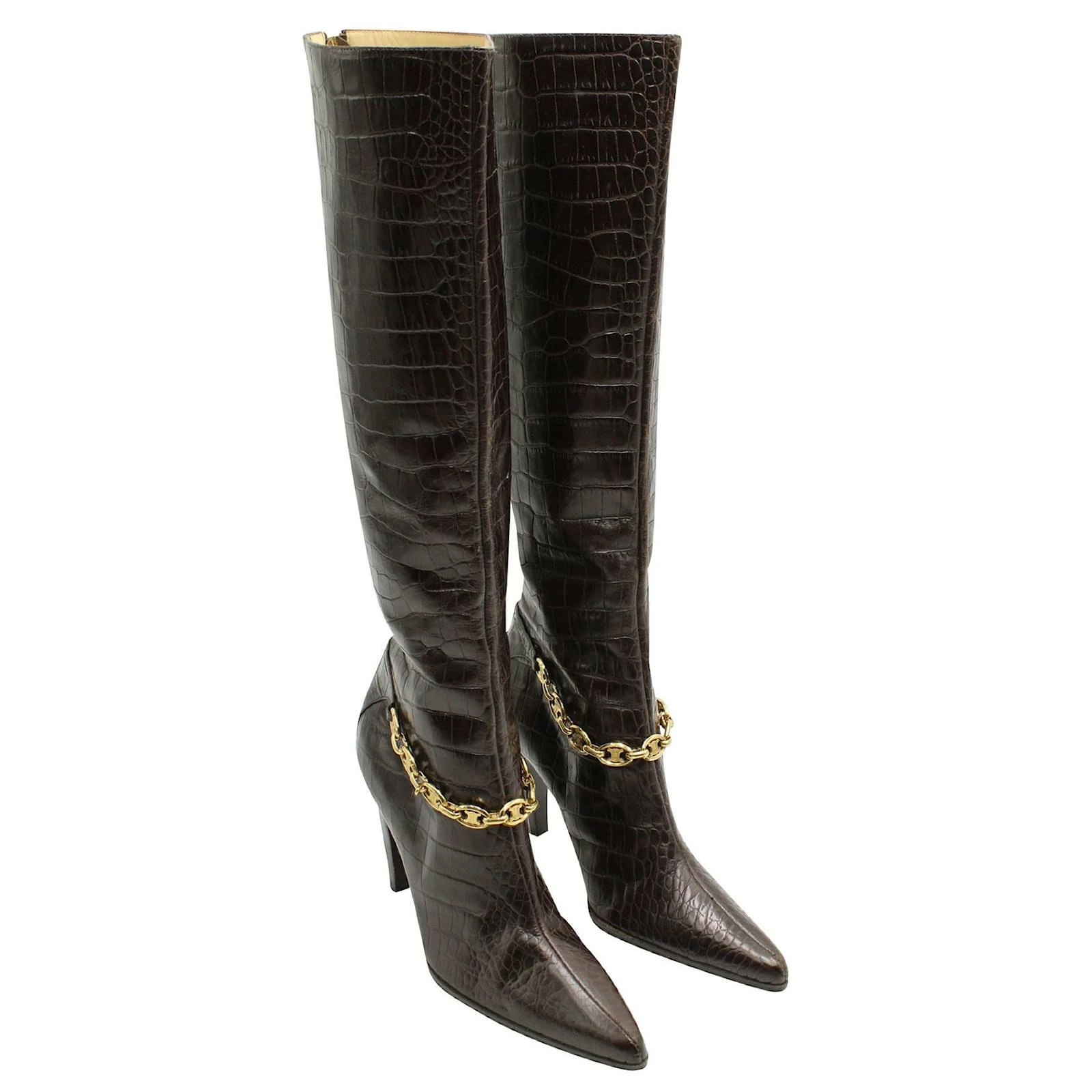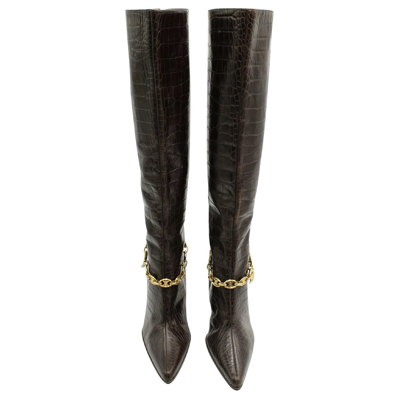 Croc-embossed leather knee-high, high-heeled boots. Lined in leather with metal chain detail. In very good condition with several scratches on the back, side & heel. resoled. Made in Italy.