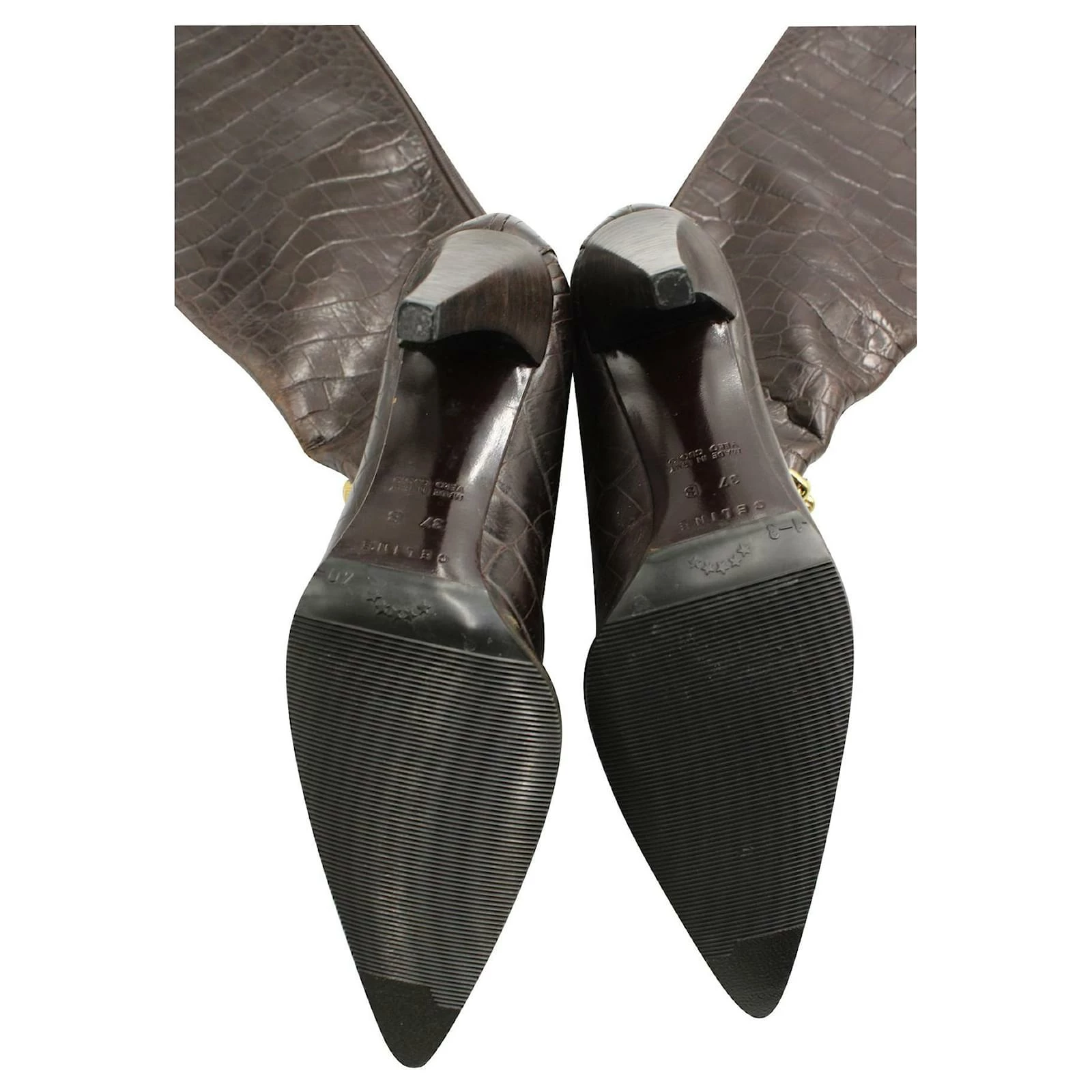 Celine Brown Croc Embossed Leather Boots with Gold Chain