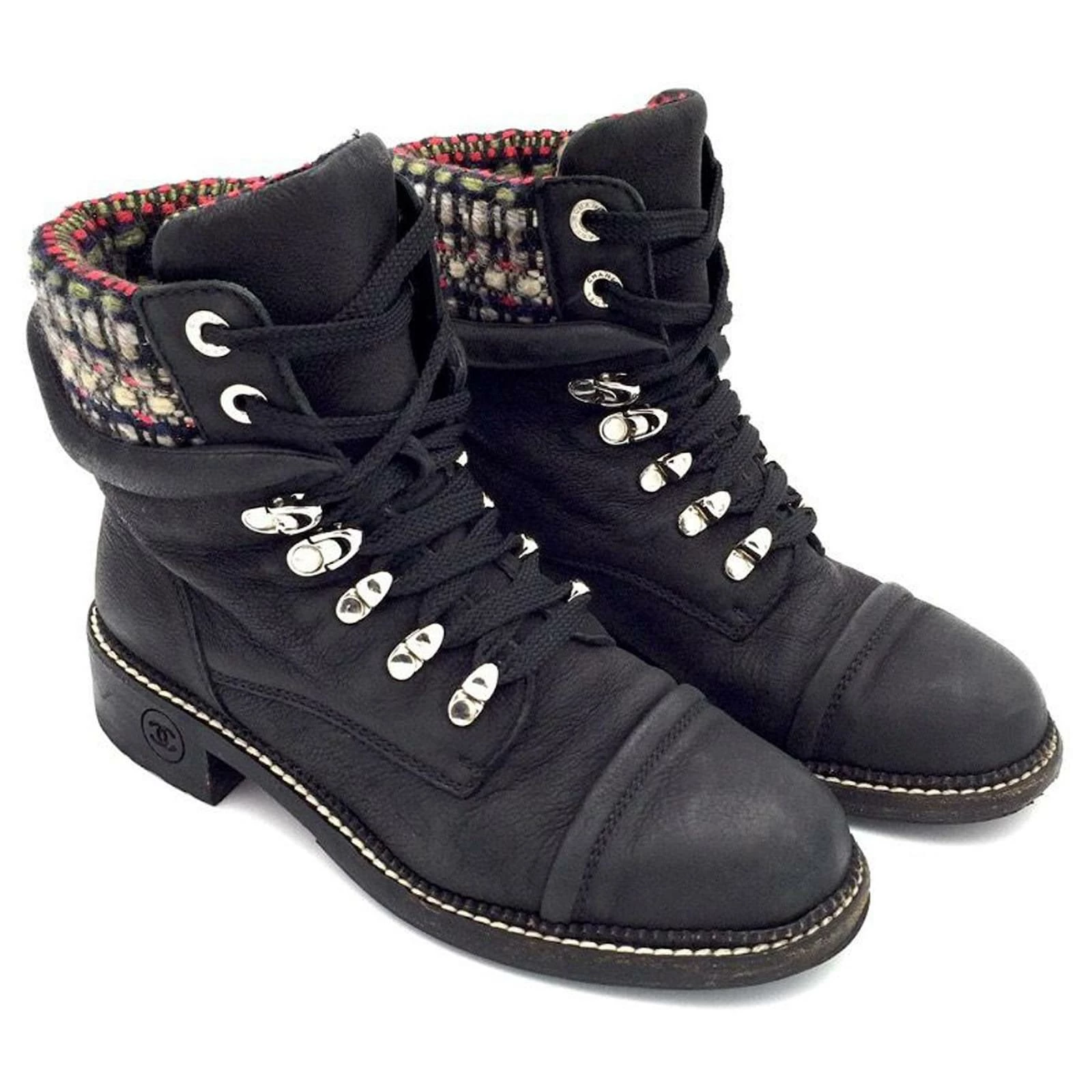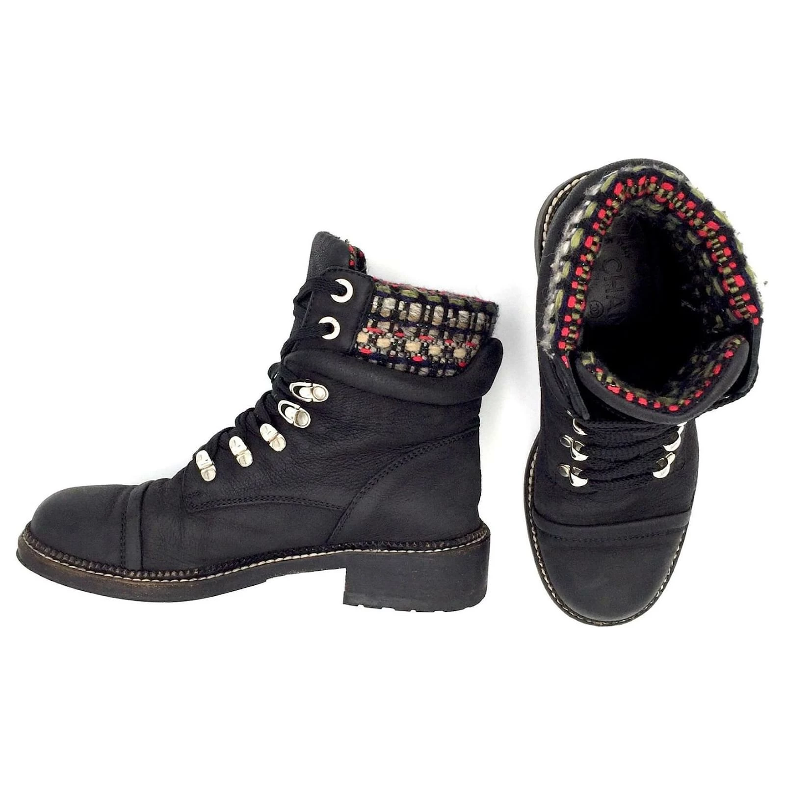 Chanel Chanel ankle boots in black leather with grey-red tweed trim