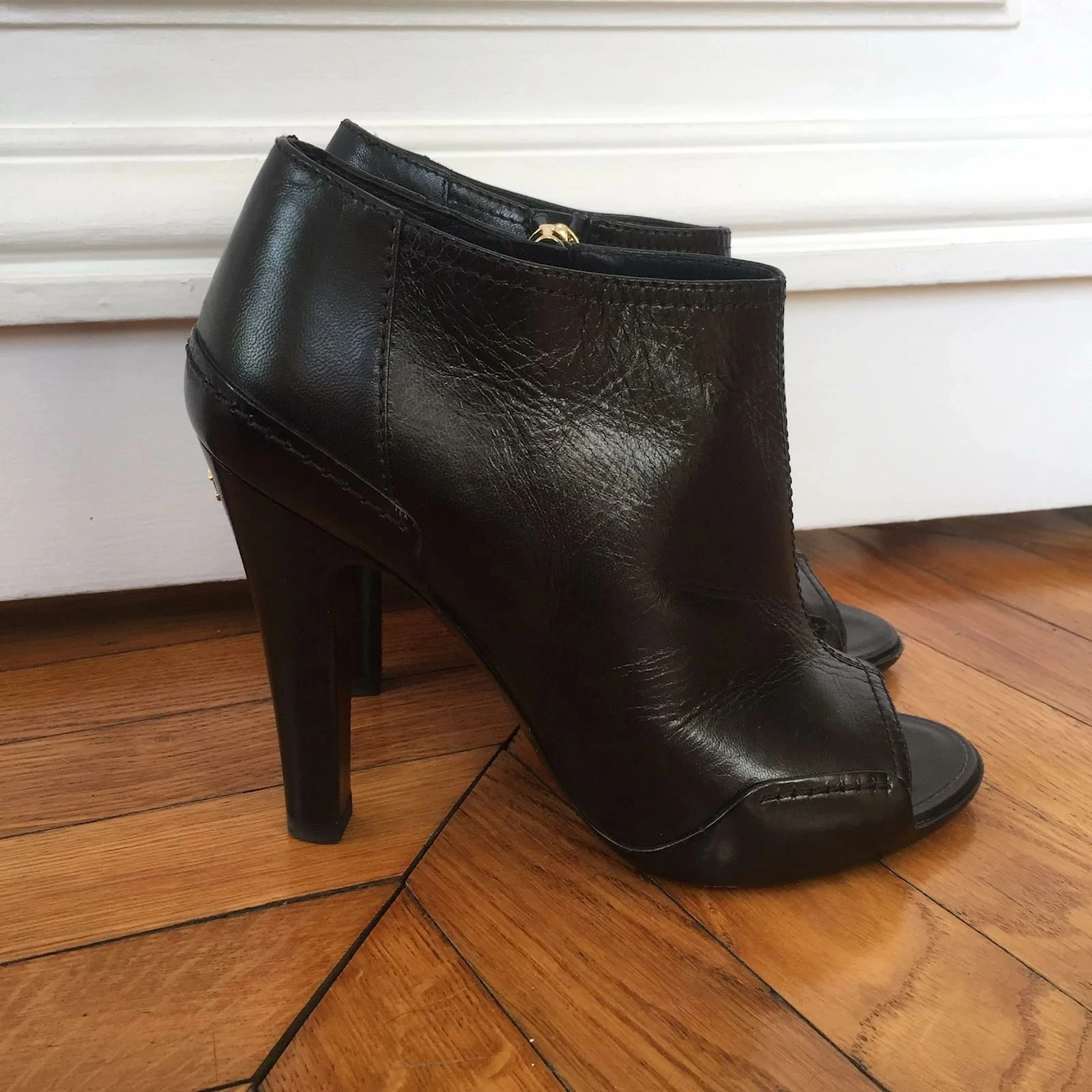 Black leather boots with open ends, CC logo in golden metal on the back.