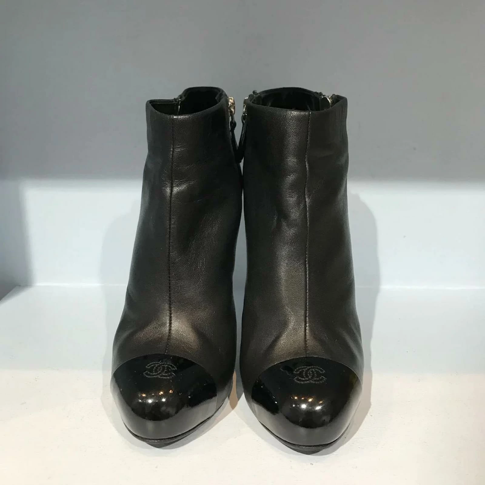 Black leather boots with varnish ends and CC logo, zip closure on the sides.