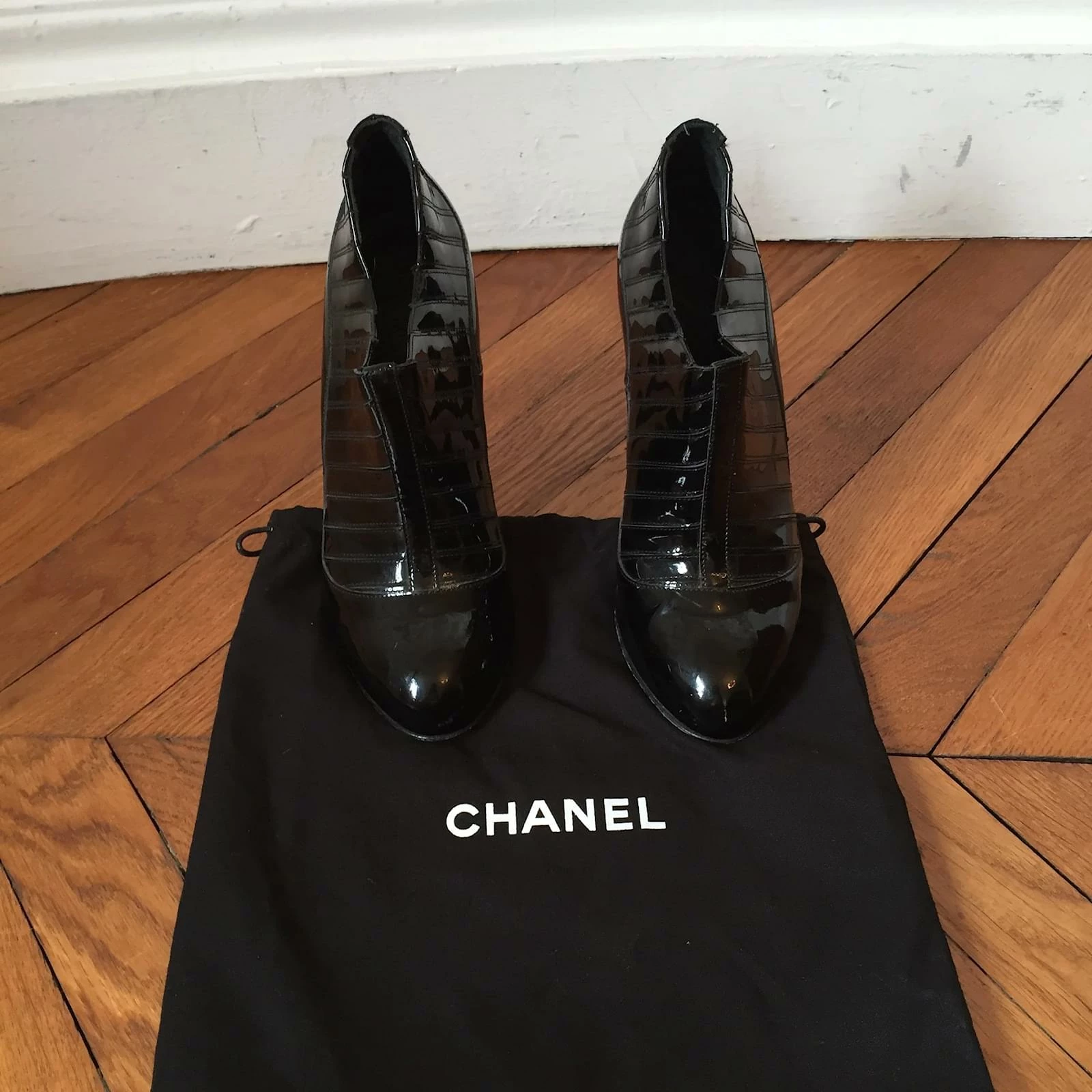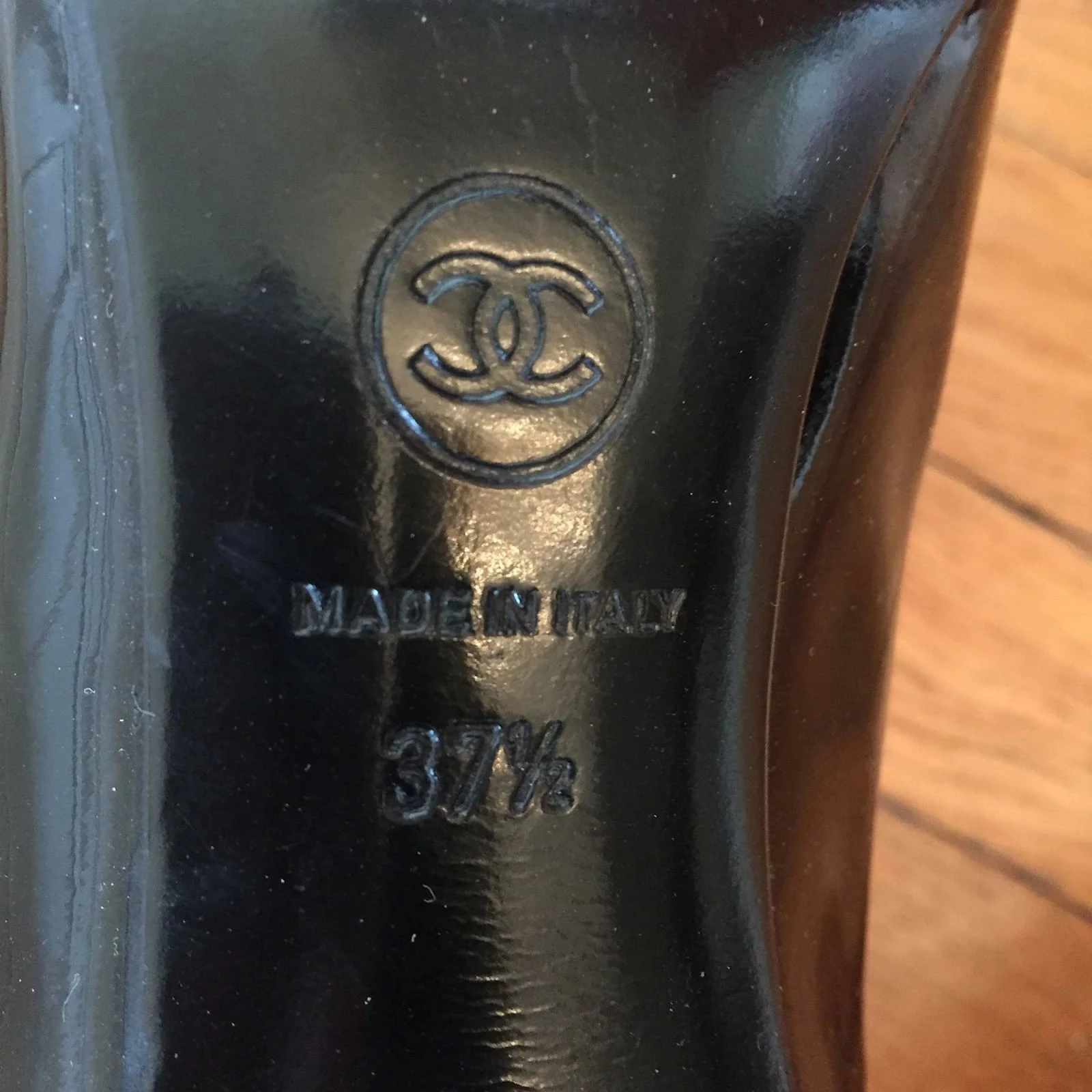 Boots ChanelPointure 37.5-boots with black patent heeled heeled from the Paris/New Yorkhautor of heels 10 cm Very good condition, With dustbag.