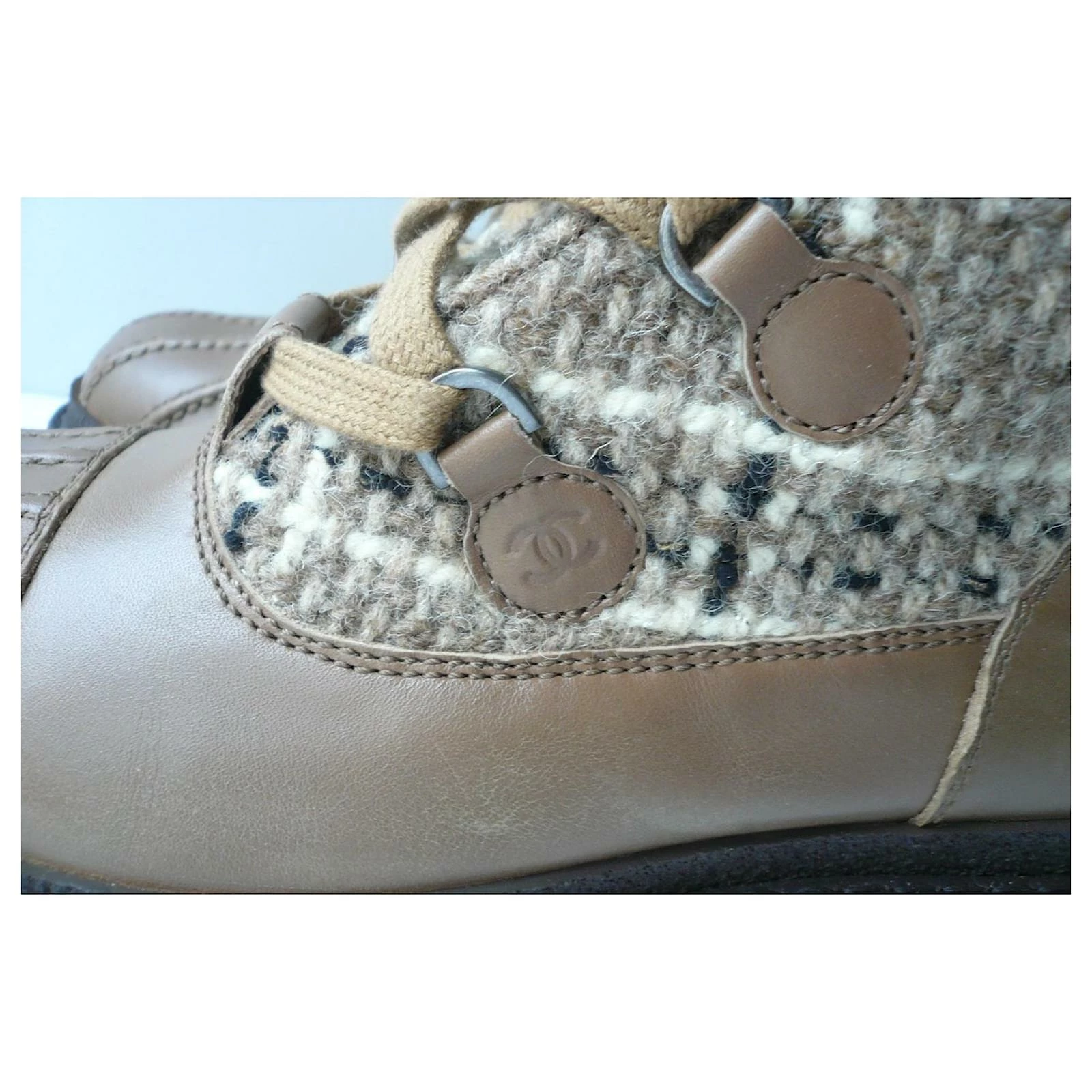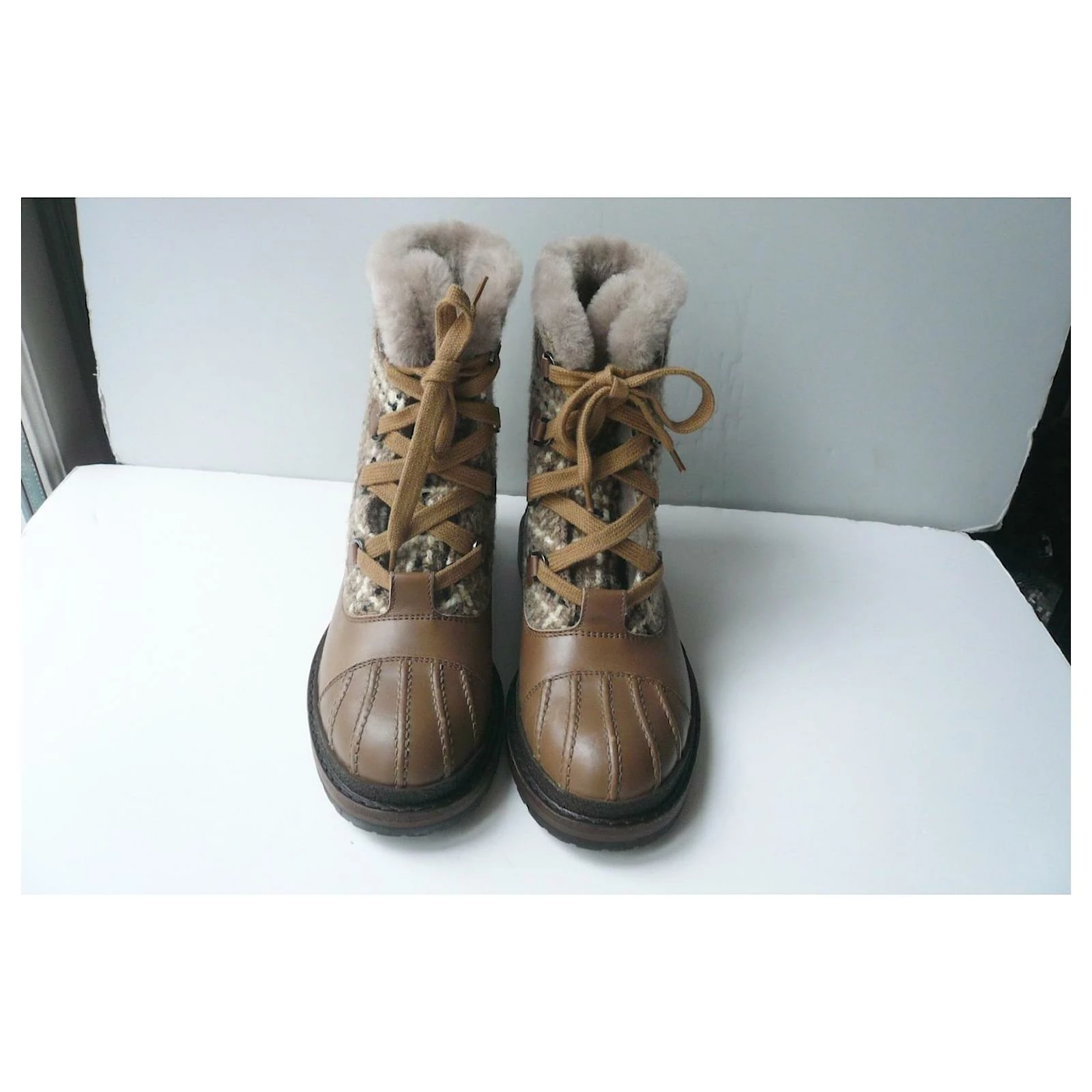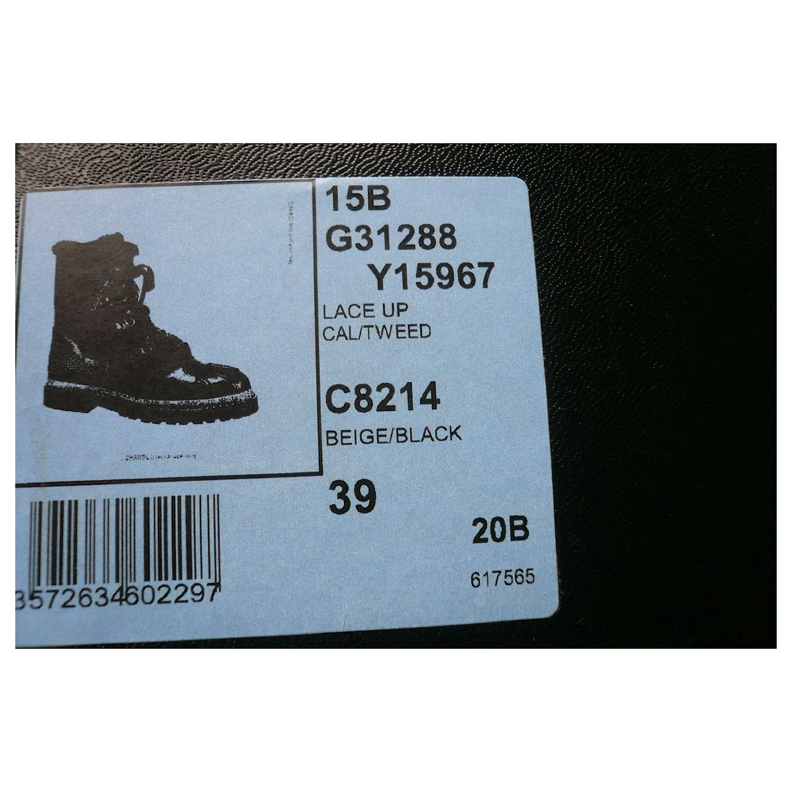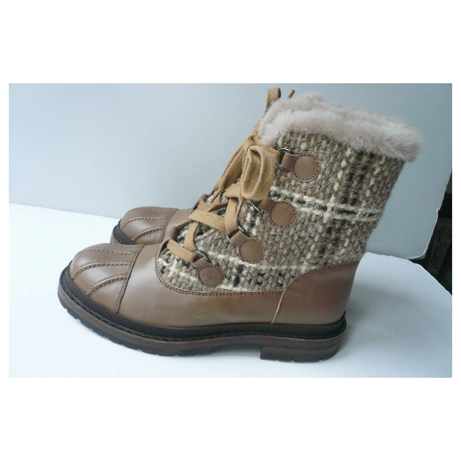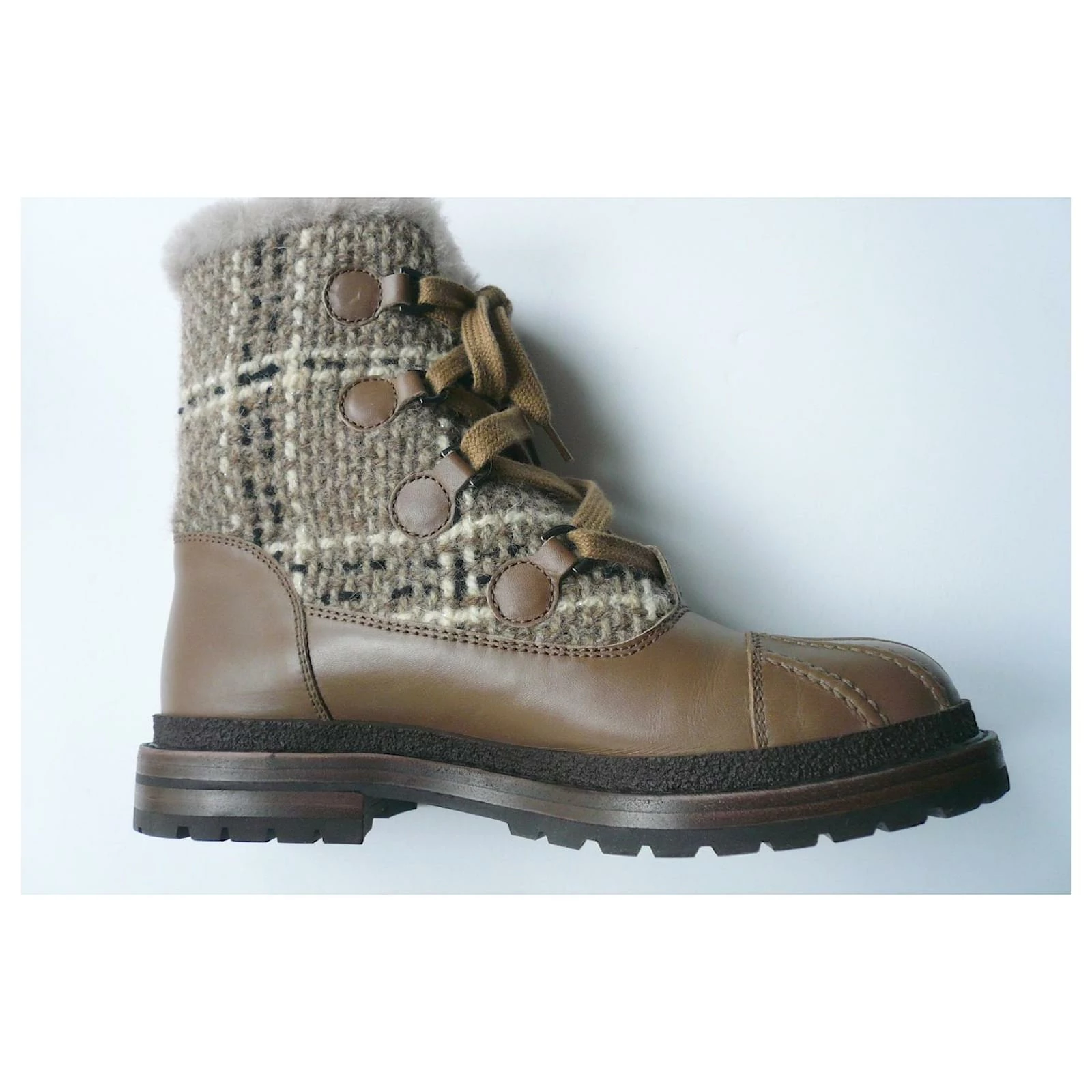 CHANEL Fur-lined boots in leather and café au lait tweed CONDITION NEAR NEW T.39 IT / Tweed Shearling Lace Up Short Boots 39 beige