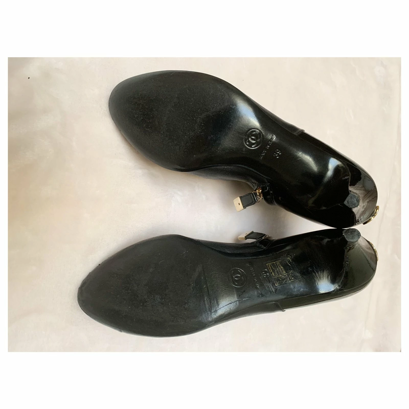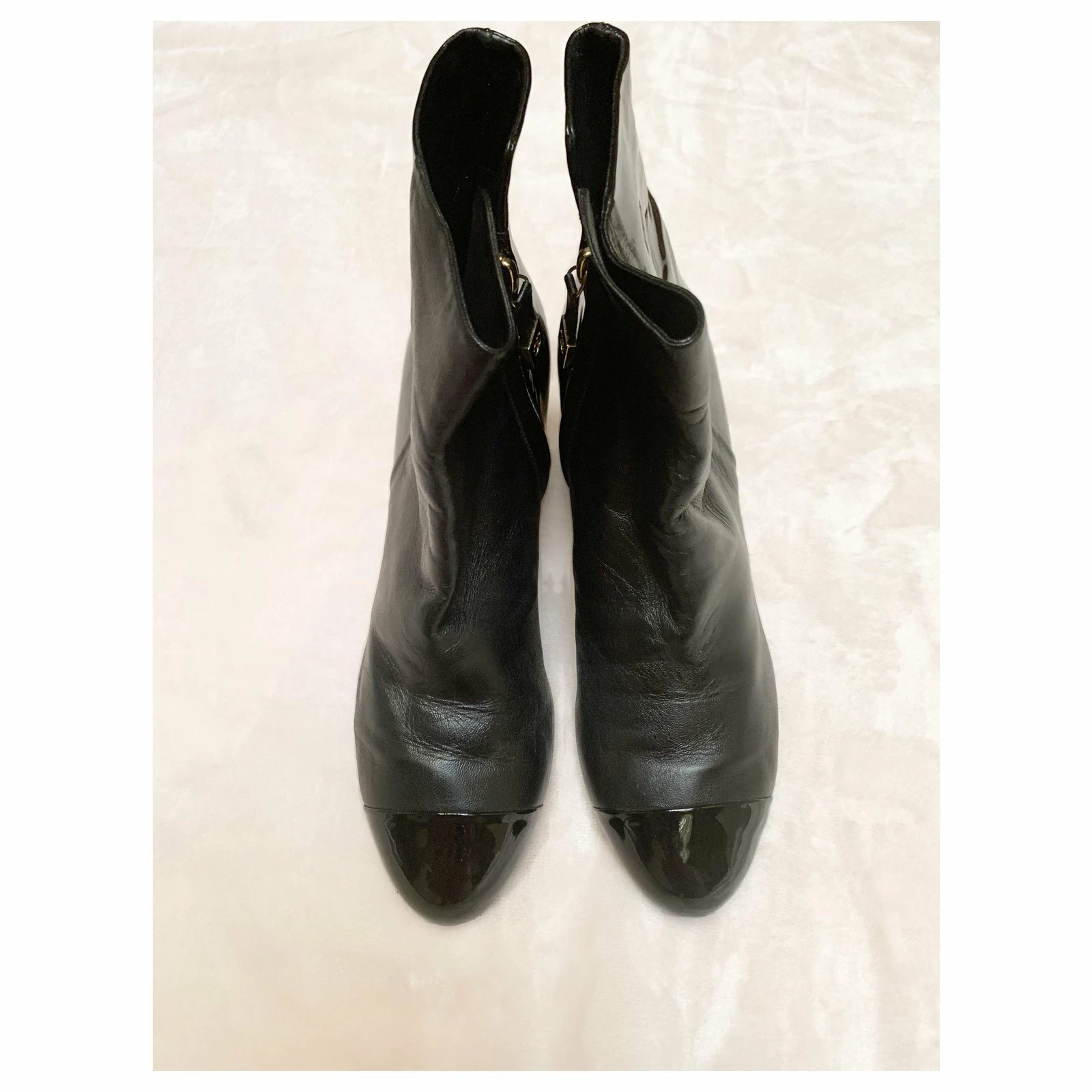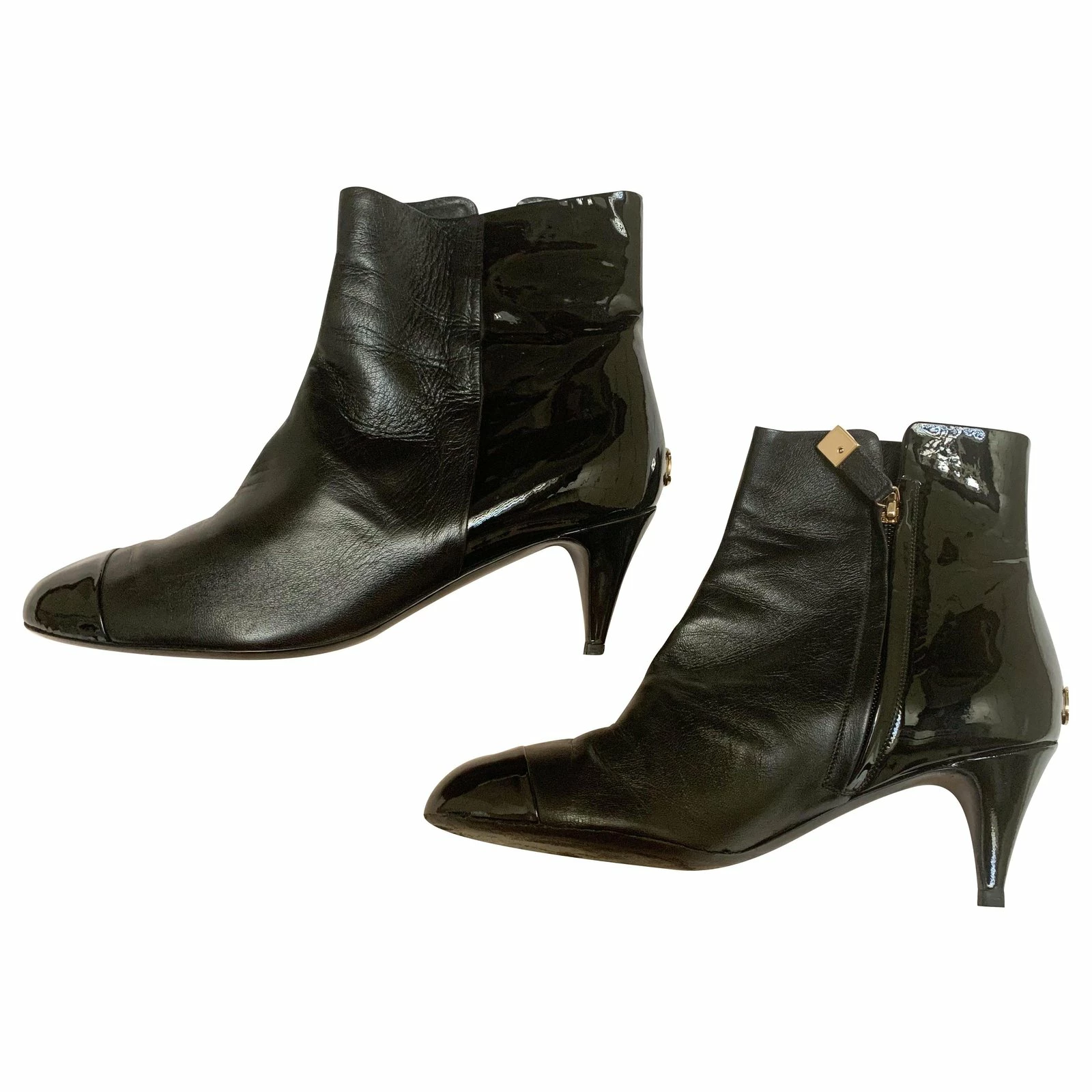 Pretty low heel ankle boots, 6 cm, black leather. Varnished ends, brand characteristic, varnished back panel with golden CC decoration. Very good condition. Slight marks on the heel.