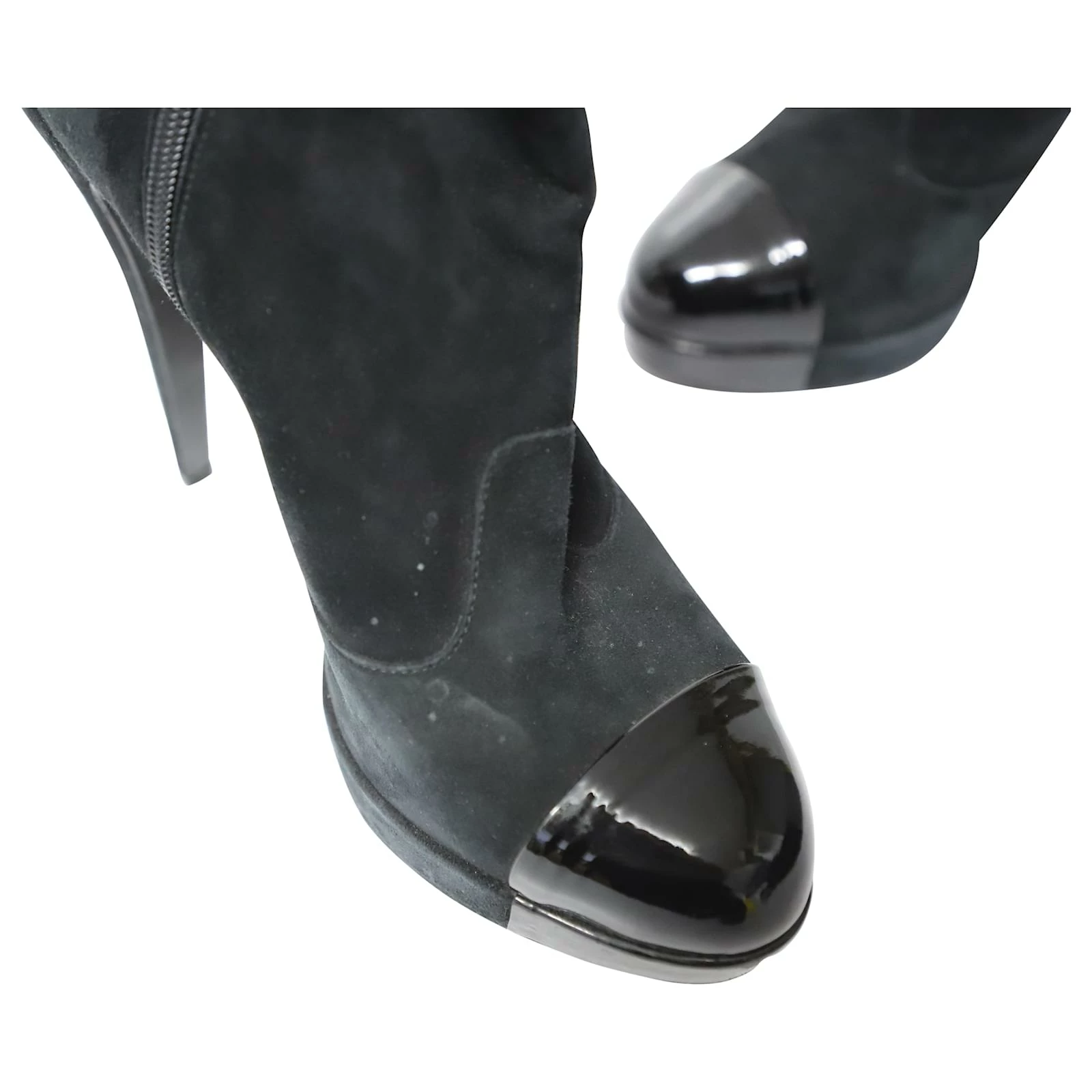 These boots from Chanel feel like a dream and fit as they have exclusively been crafted just for you. A pair of supreme-quality suede boots are just what you need to make a lasting impression. These feature patent cap toes, zippers, Interlocking CC Logo, 140 mm heels, and supported by 20 mm platforms.