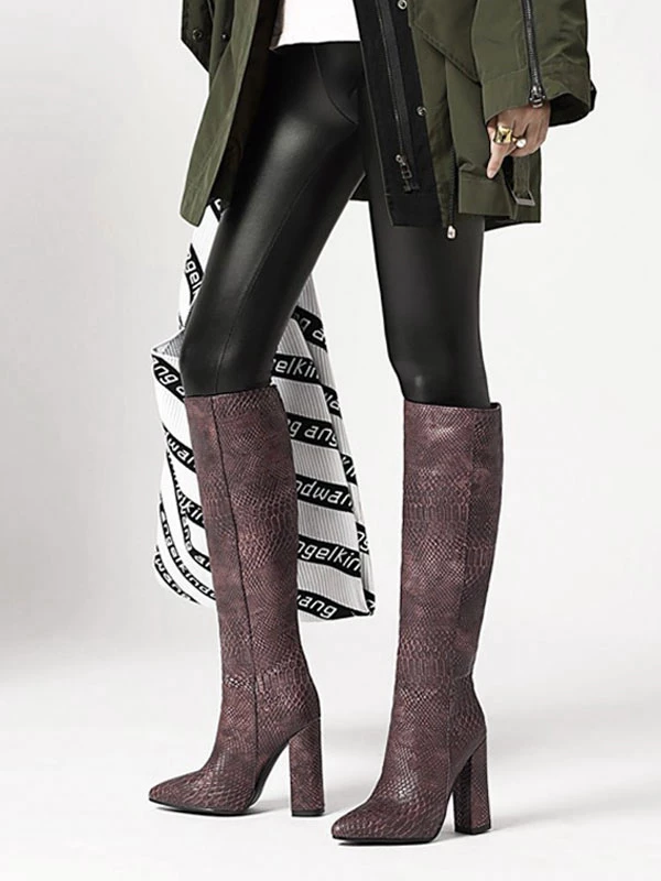 Coffee Brown Knee-High Boots For Women Pointed Toe Chunky Heel Boots