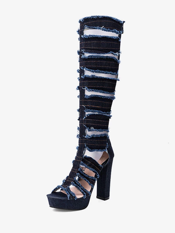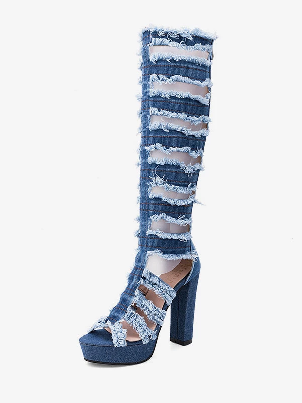 Be the first to review “Denim Open Toe Chunky Heel Cut Out Knee High Summer Boots” Cancel reply