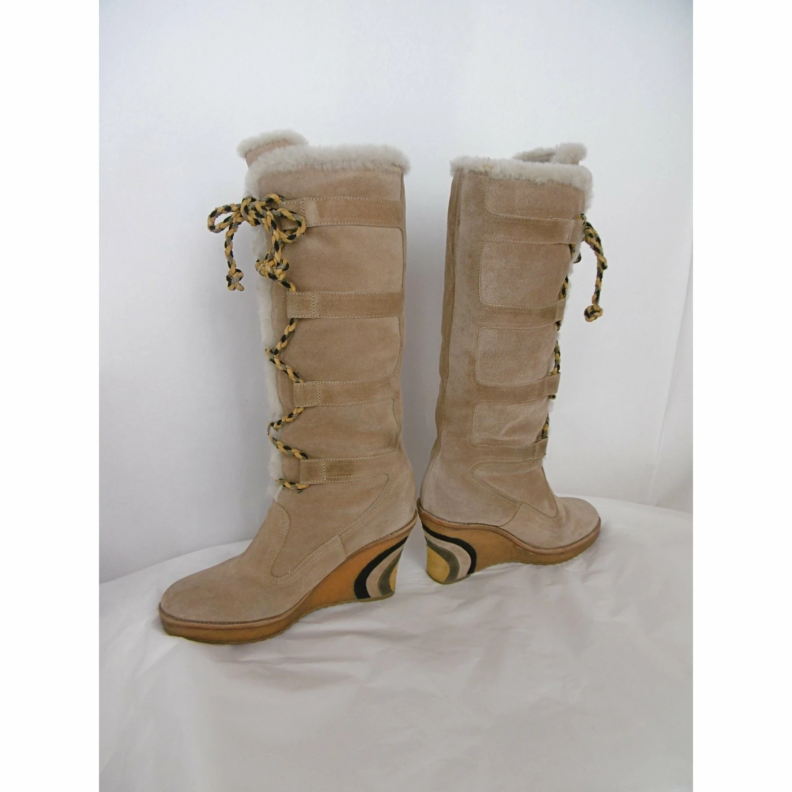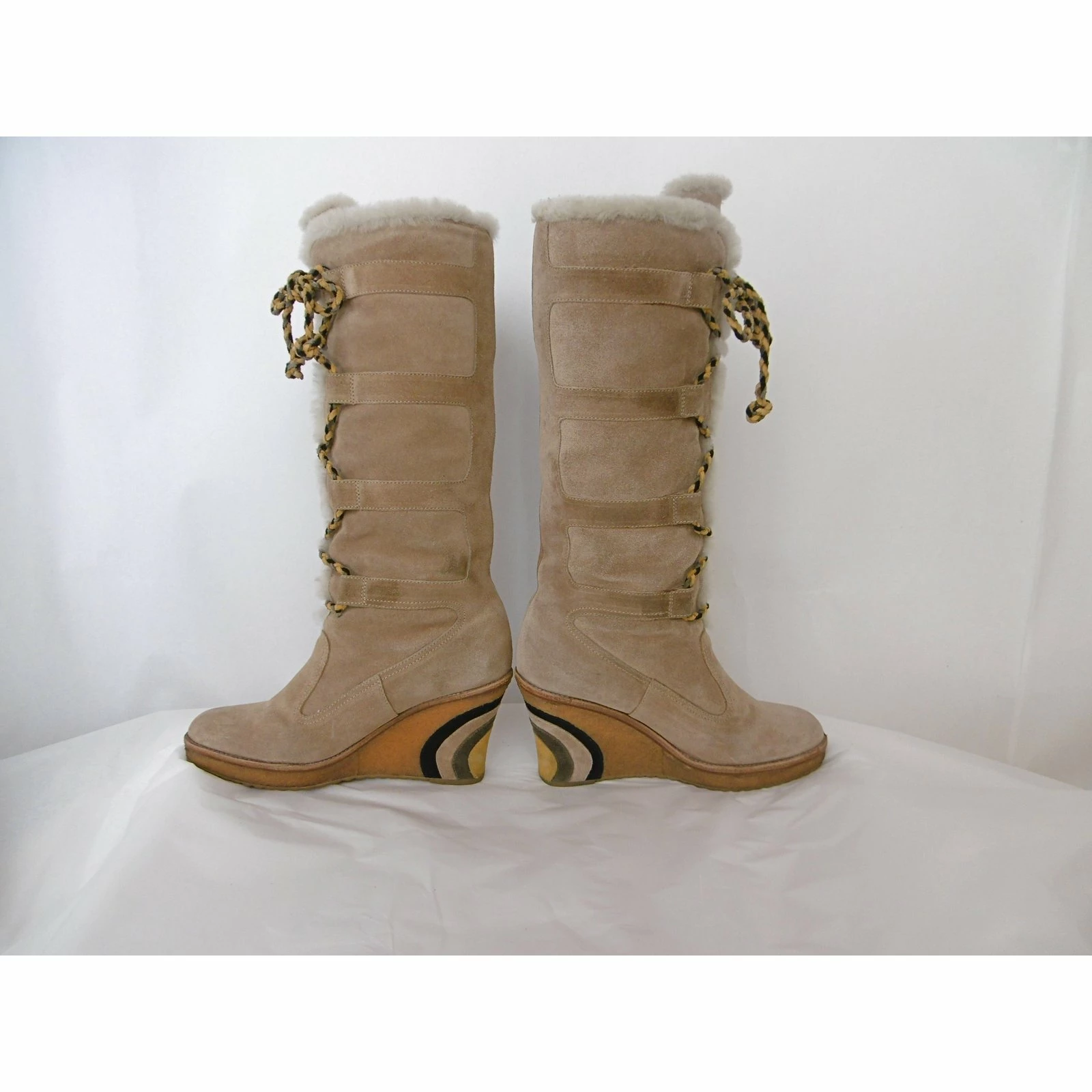Emilio Pucci Leather Mouton Knee Length Boots Beige