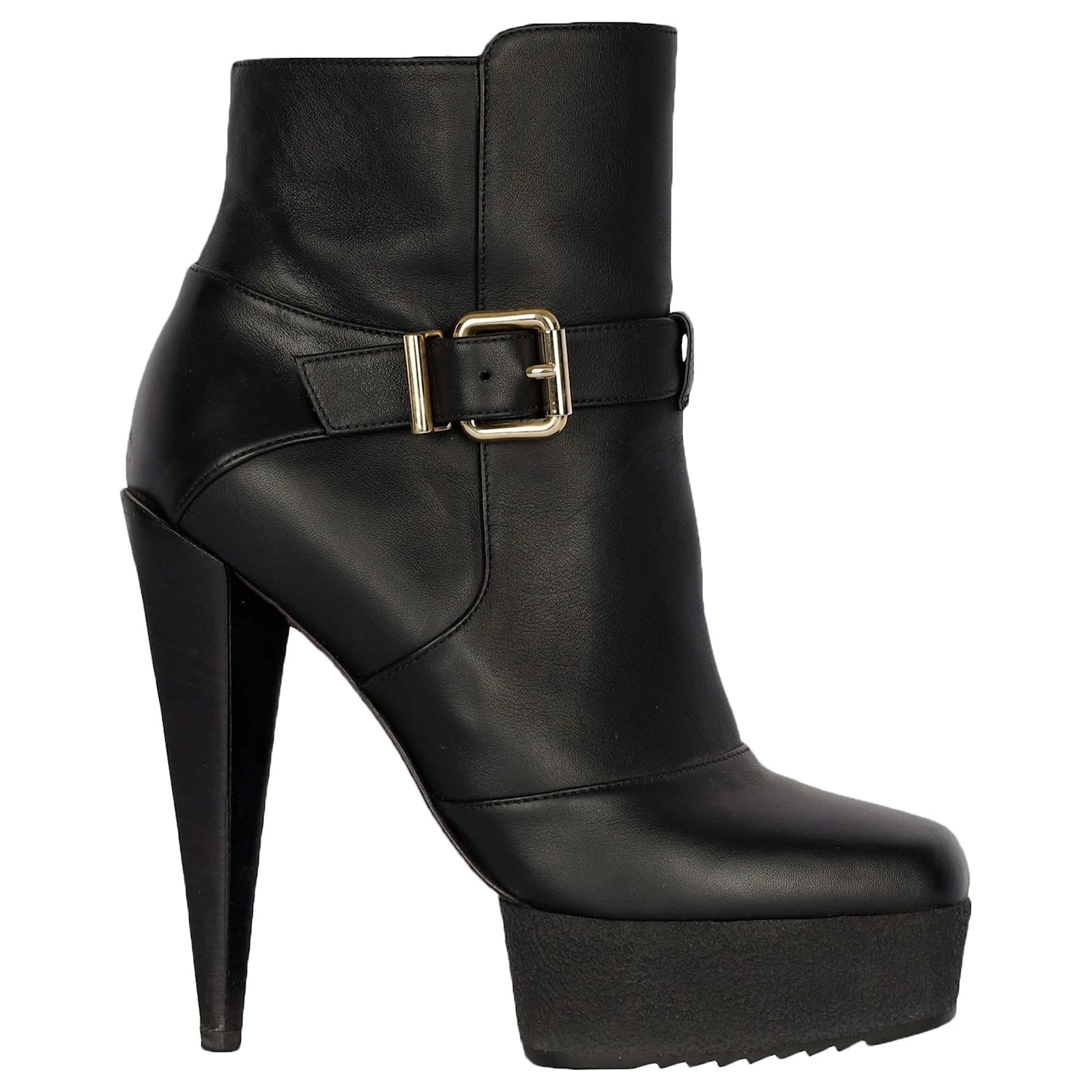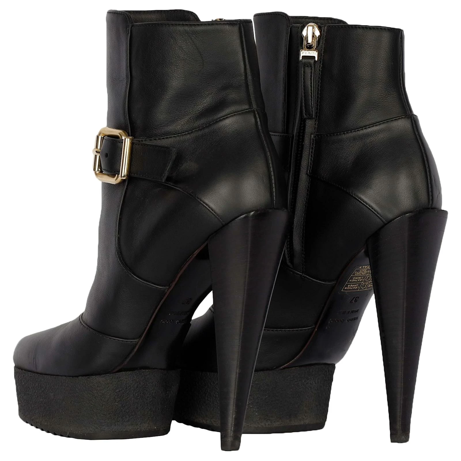 Crafted with black leather, the Fendi Black Leather Ankle Boots with heels feature stitched leather panels and golden attachments etched with the brand logo. The unique shape of the heels along with the distinct overall vibe make it truly one-of-a-kind.