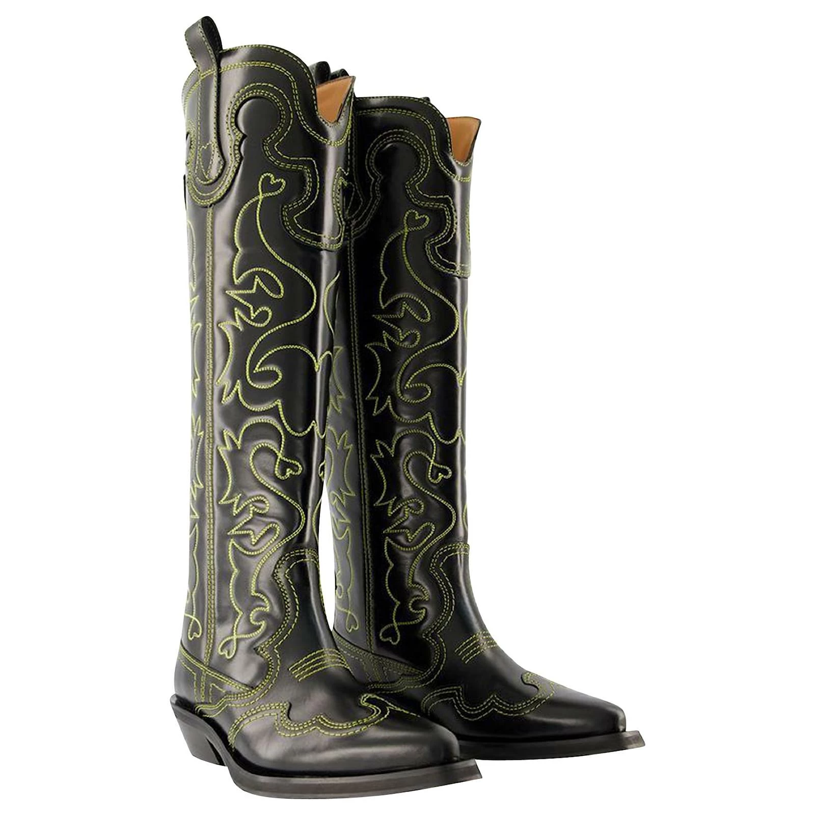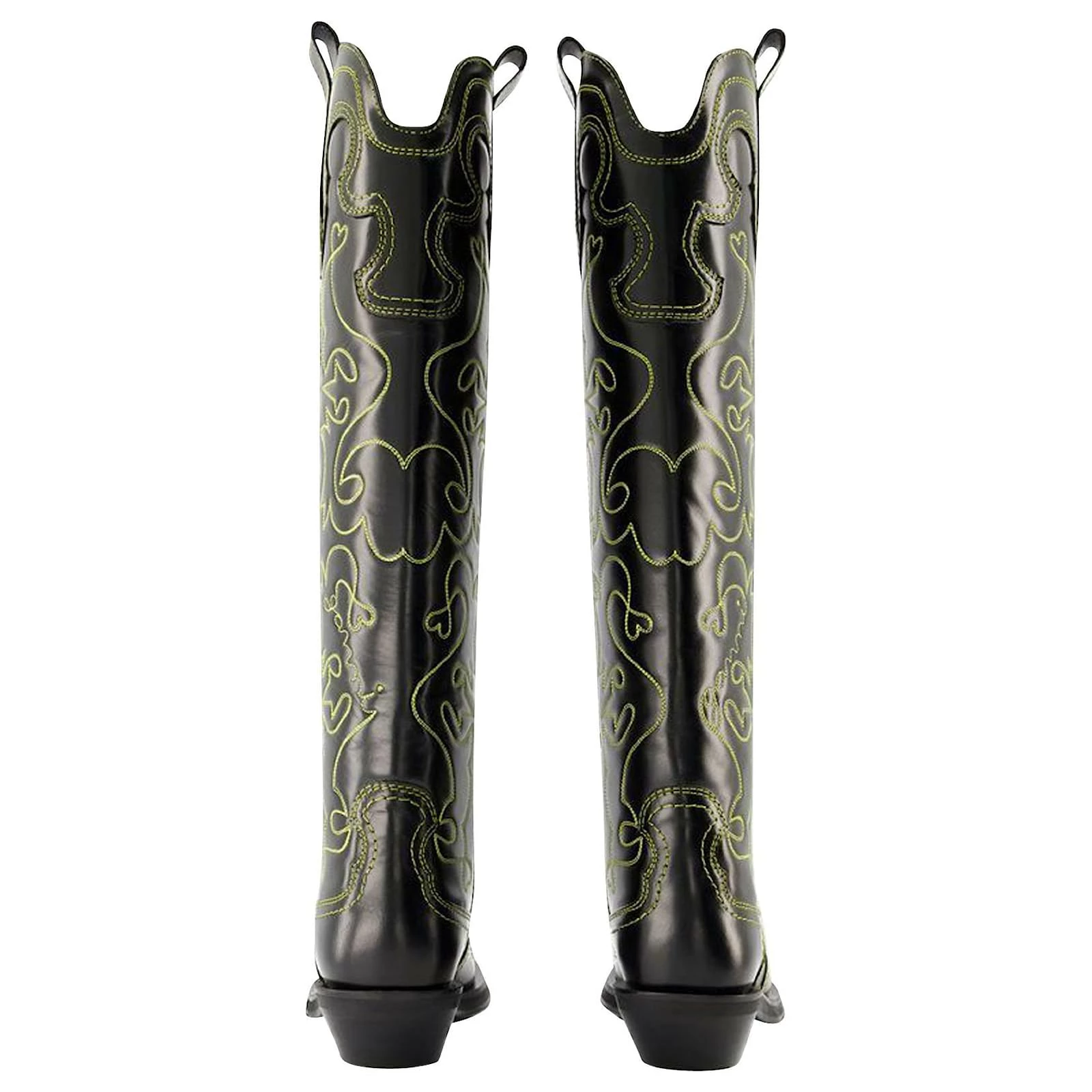 Ganni Knee High Embroidered Western Boots In Black Leather