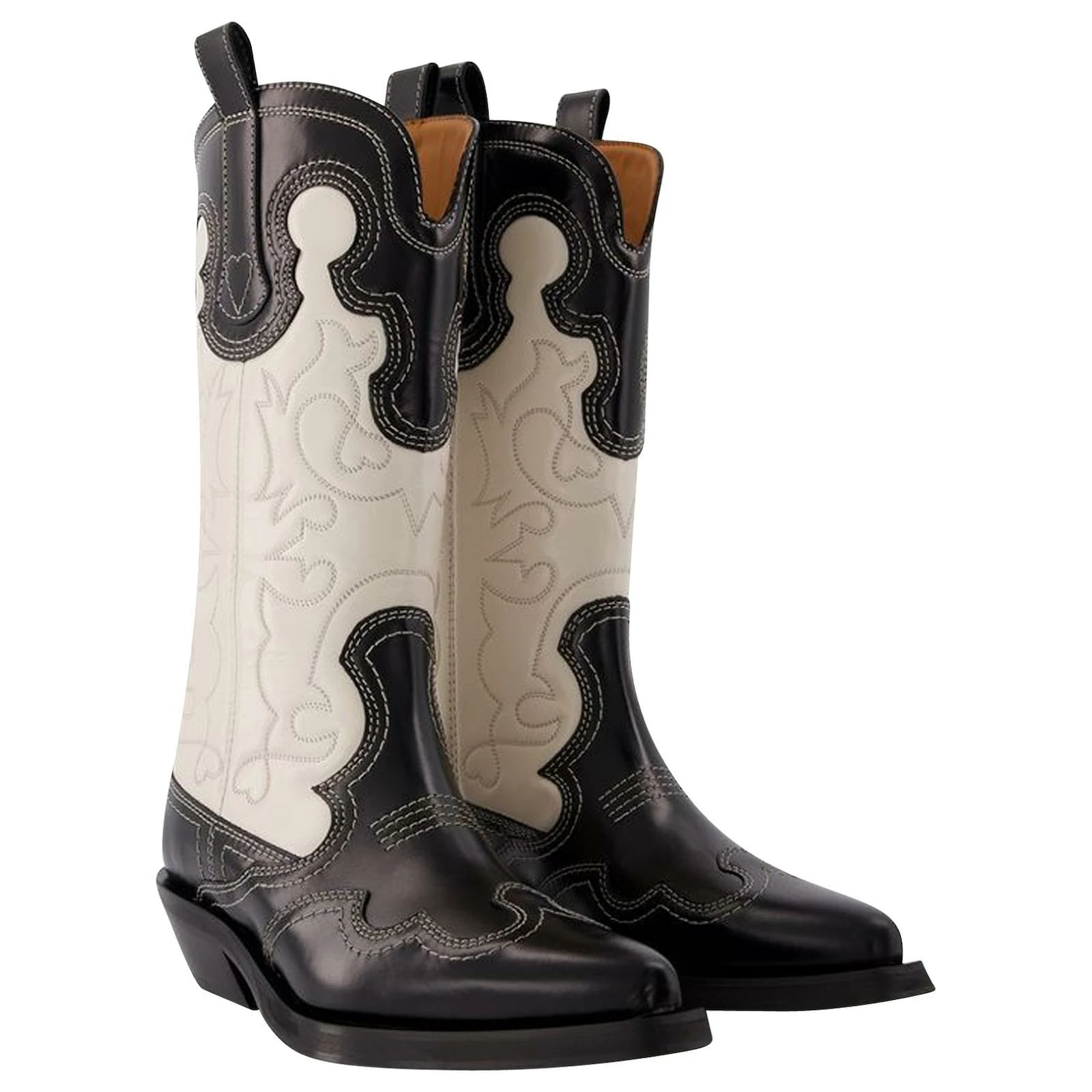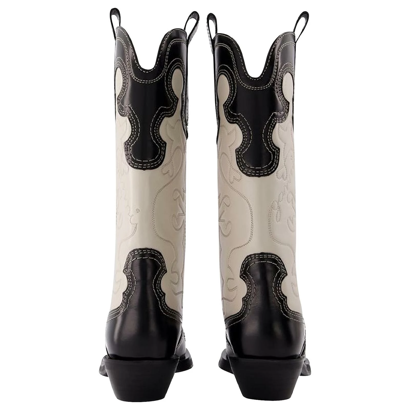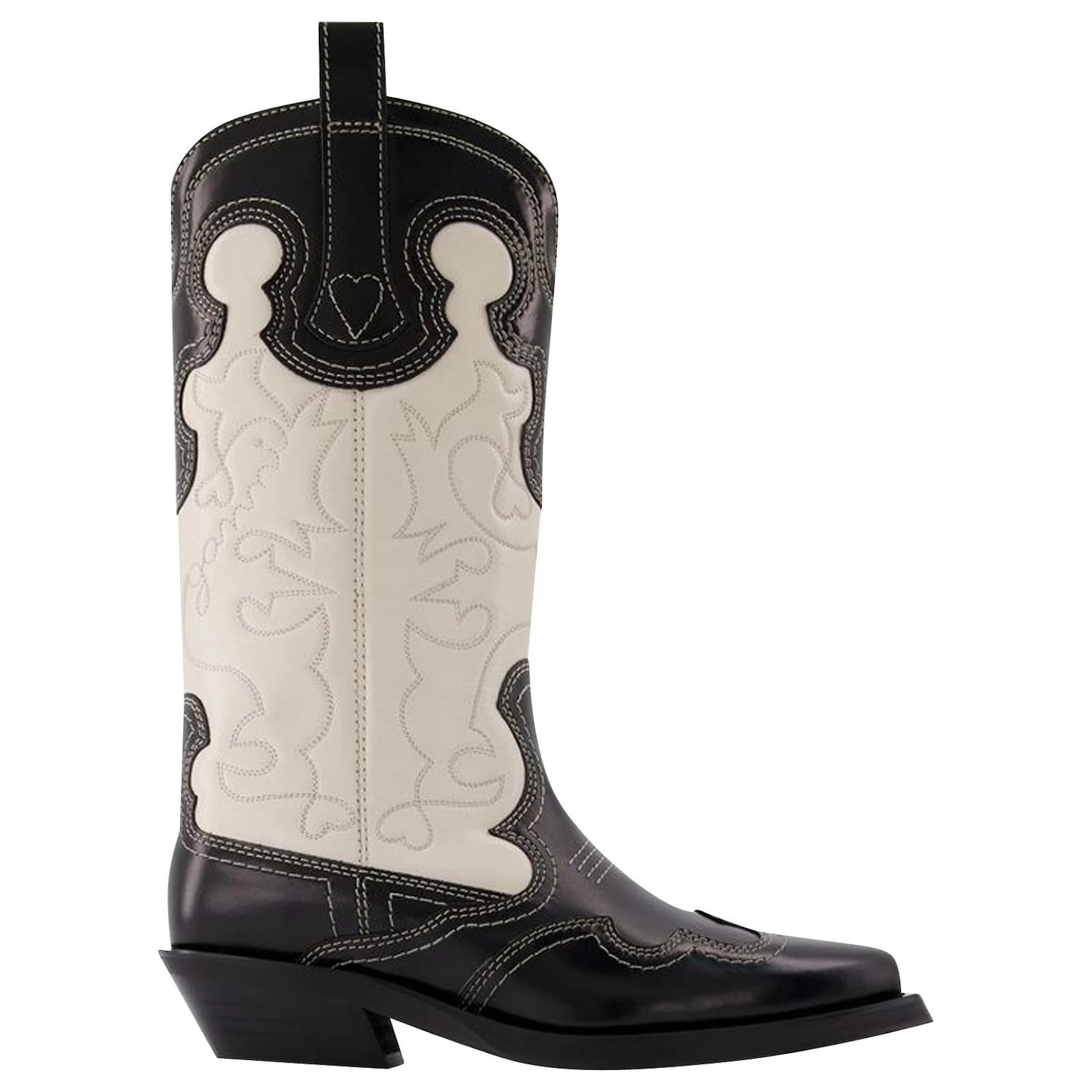Ganni Mid Shaft Embroidered Western Boots In Black Leather