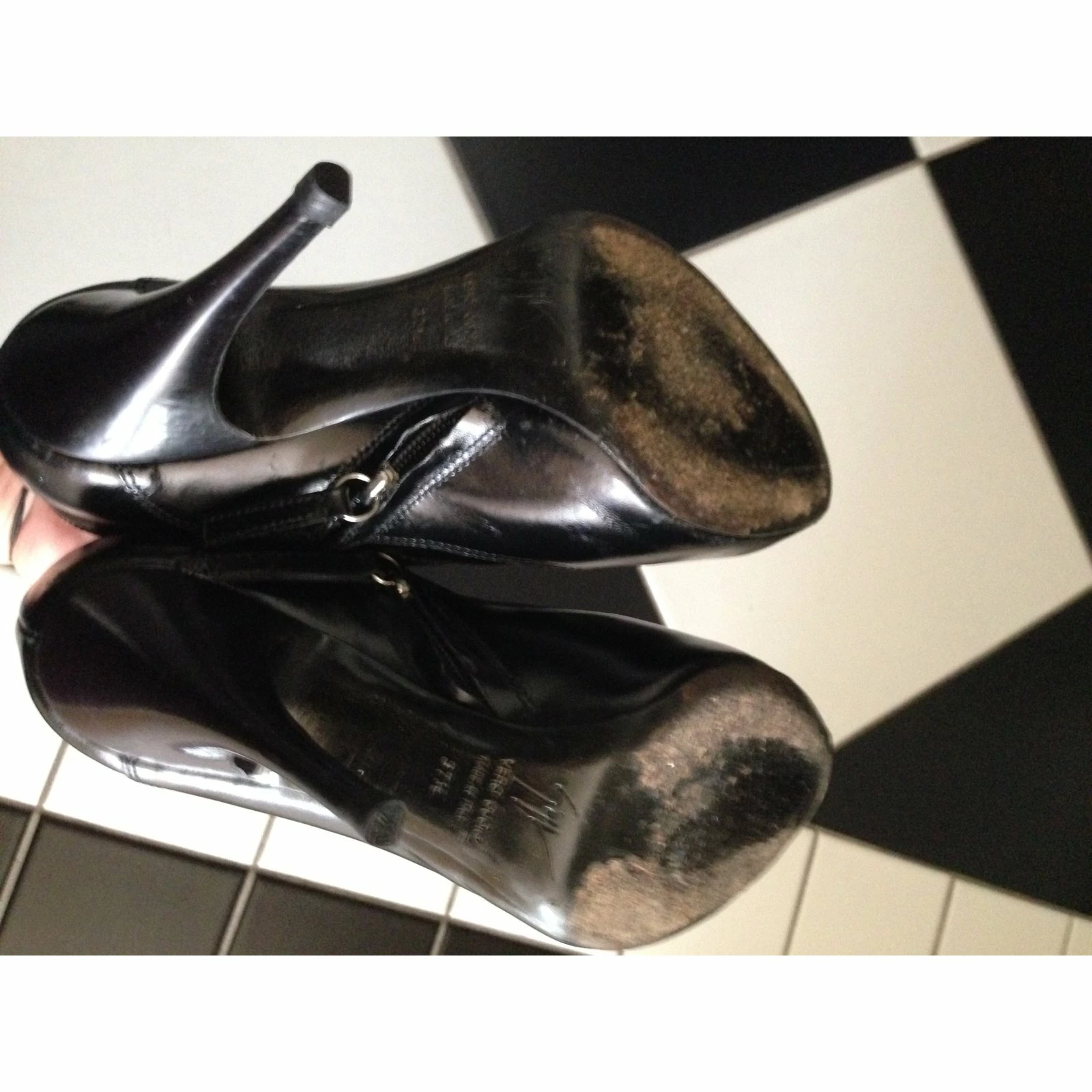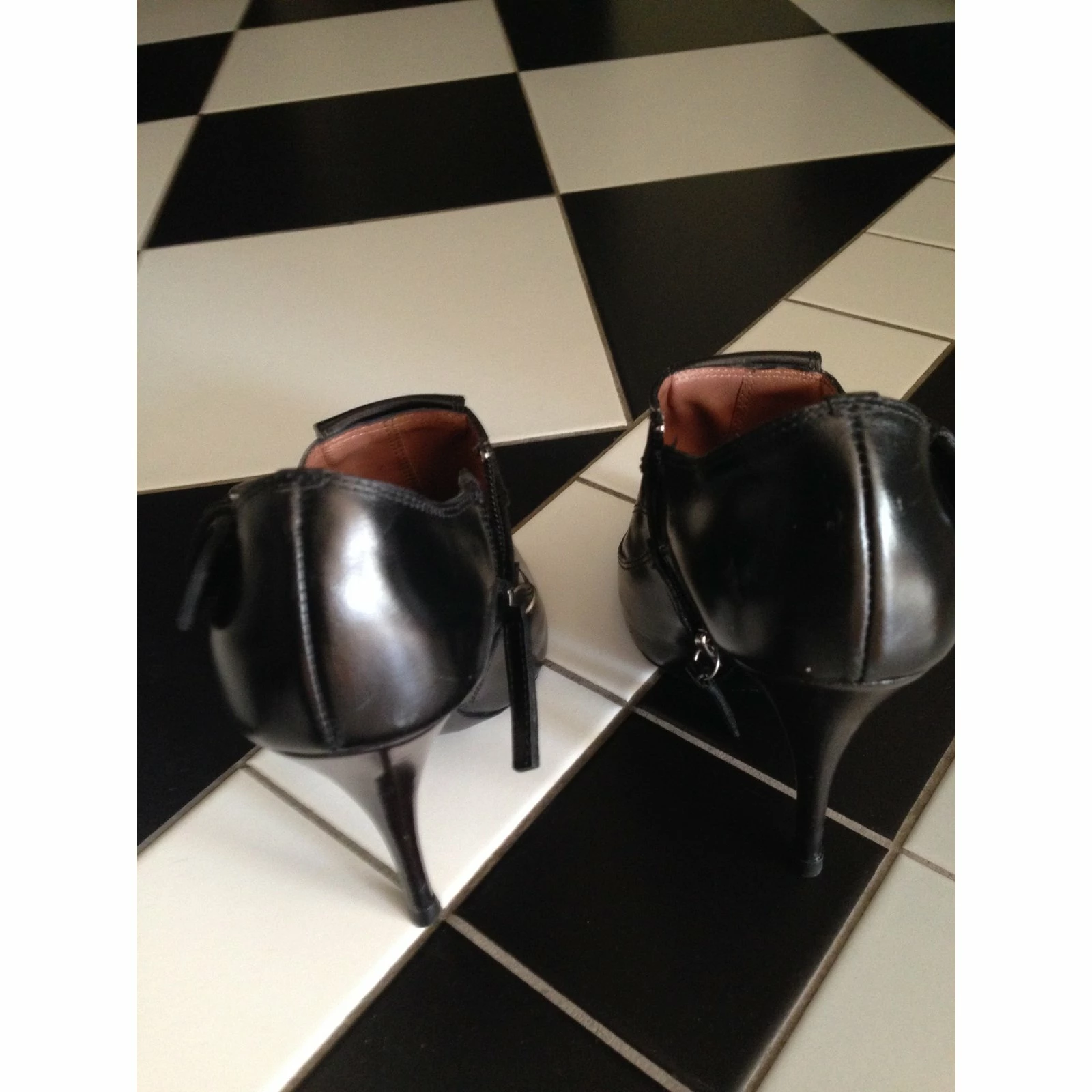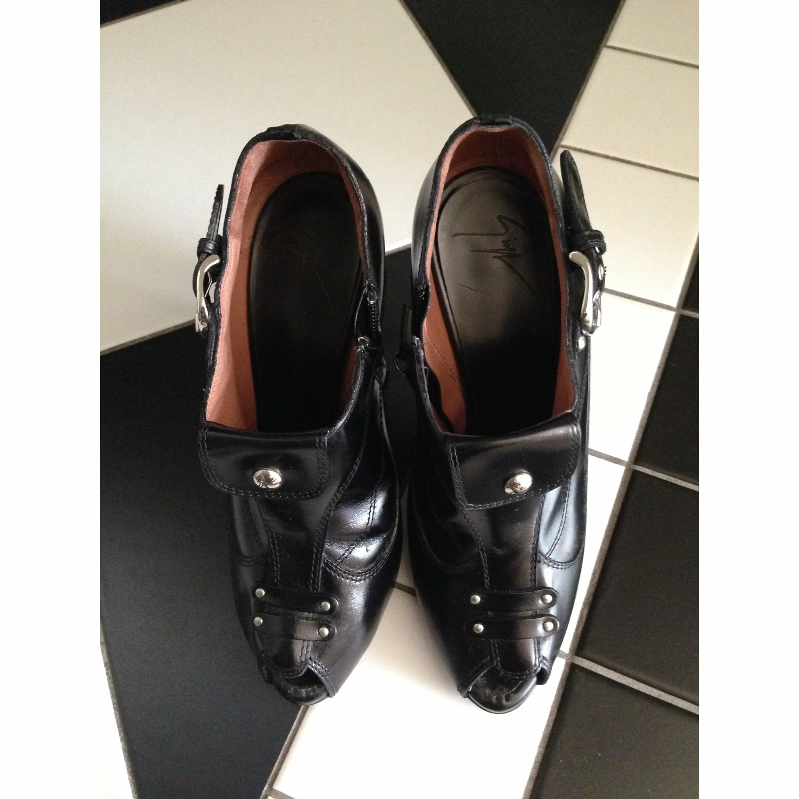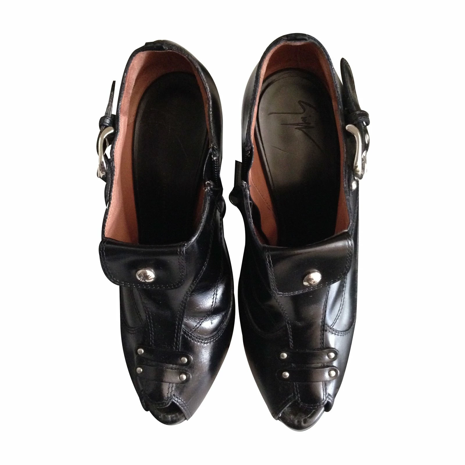 Black leather peep-toe boots. Fits perfectly to size IT 37-37,5. Has some signs of wear and some scratches due to wear.