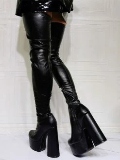 Women Over The Knee Boots Platform Plus Size Chunky Heel PU Leather Black Thigh High Boots