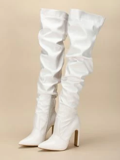 Women Over The Knee Boots Chunky Heel Pointed Toe PU Leather White Thigh High Boots