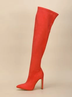 Women Over The Knee Boots Chunky Heel Pointed Toe Micro Suede Upper Orange Red Thigh High Boots