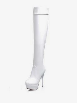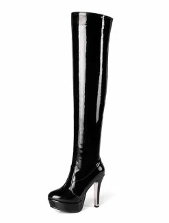 Platform Thigh High Boots Womens Solid Color Bright Leather Round Toe Stiletto Heel Boots