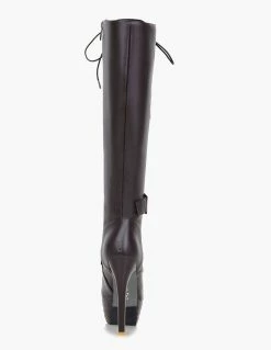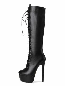 Platform Knee High Boots Womens Solid Color Lace Up Round Toe Stiletto Heel Boots