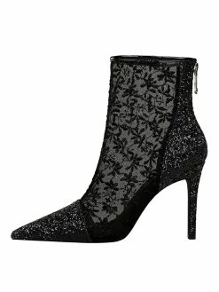 Women Ankle Boots Black Lace Pointed Toe Sequins Stiletto Heel High Heel Booties
