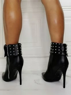 Women Booties Pointed Toe Stiletto Heel PU Leather High Tops Black Ankle Boots