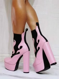 Women Booties Geometric Round Toe Platform Chunky Heel PU Leather High Tops Pink Ankle Boots