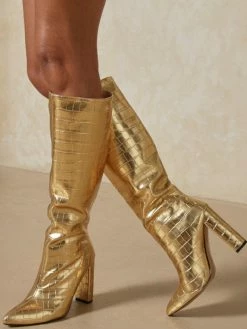 Women Booties Pointed Toe Chunky Heel PU Leather Blond Knee-High Boots
