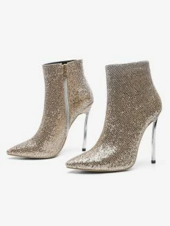 Women Ankle Boots Light Gold Sequined Pointed Toe Stiletto Heel High Heel Booties