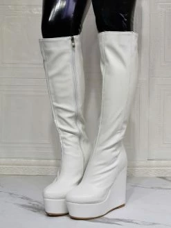 Women Knee High Boots PU Leather White Round Toe Wedge Heel Sexy High Heel Boots