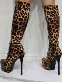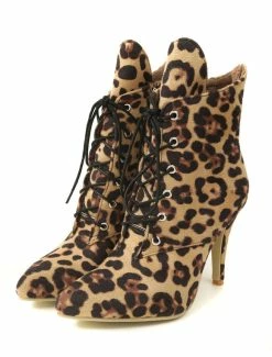 High Heel Boots Women Leopard Pointed Toe Lace Up Ankle Boots