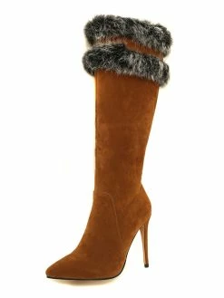 Knee High Boots Womens Micro Suede Faux Fur Pointed Toe Stiletto Heel Winter Boots
