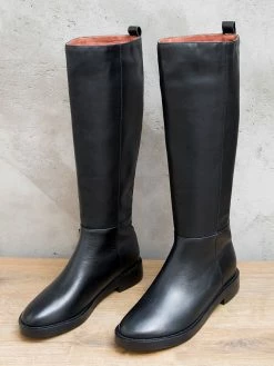 Knee High Boots Womens Black Cowhide Round Toe Flat Heel Daily Casual Boots