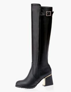 Knee High Boots Womens Leather Buckled Round Toe Block Heel Winter Boots
