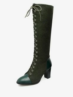 Knee High Boots Womens And Micro Suede Lace Up Round Toe Chunky Heel Boots