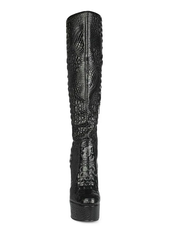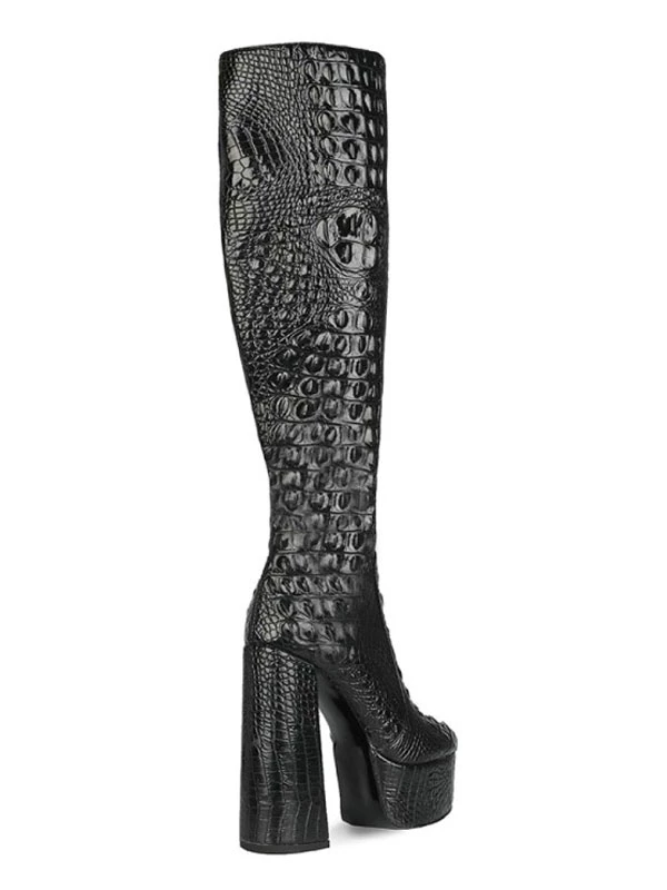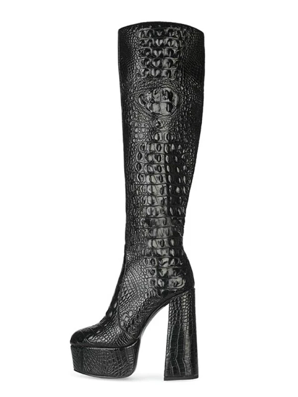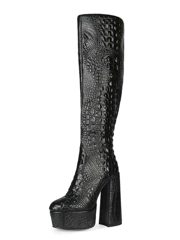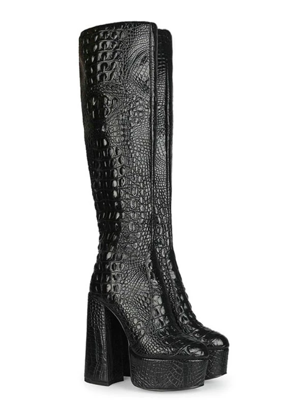 Knee-High Boots Black Round Toe Chunky Heel Snakeskin Leather Knee Length Boots