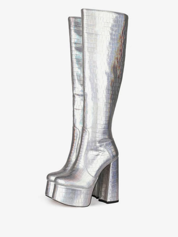 Knee-High Boots Leather Silver Round Toe Bright Leather Chunky Heel Dazzling Women Knee Length Boots