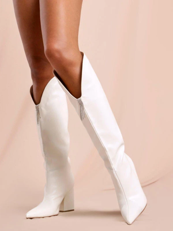 Knee-High Boots PU Leather Black Pointed Toe Chunky Heel 4.1″ Woman Knee Length Boots