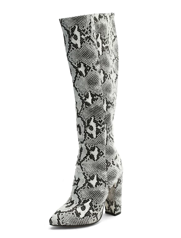 Knee High Boots Womens Snake Print Pointed Toe Chunky Heel Boots