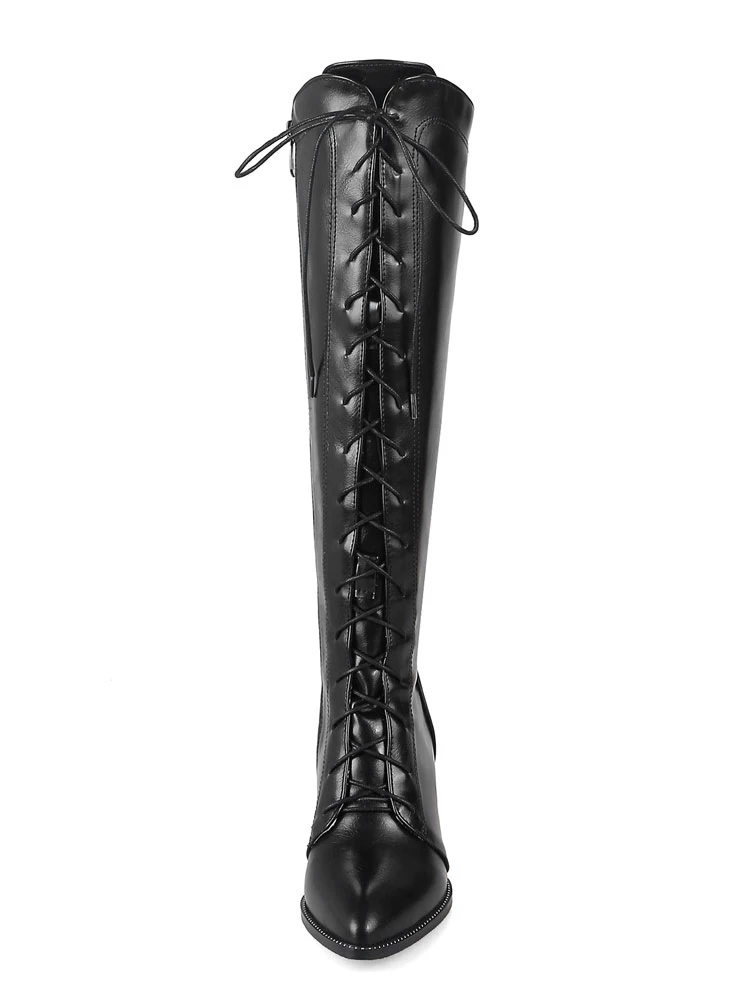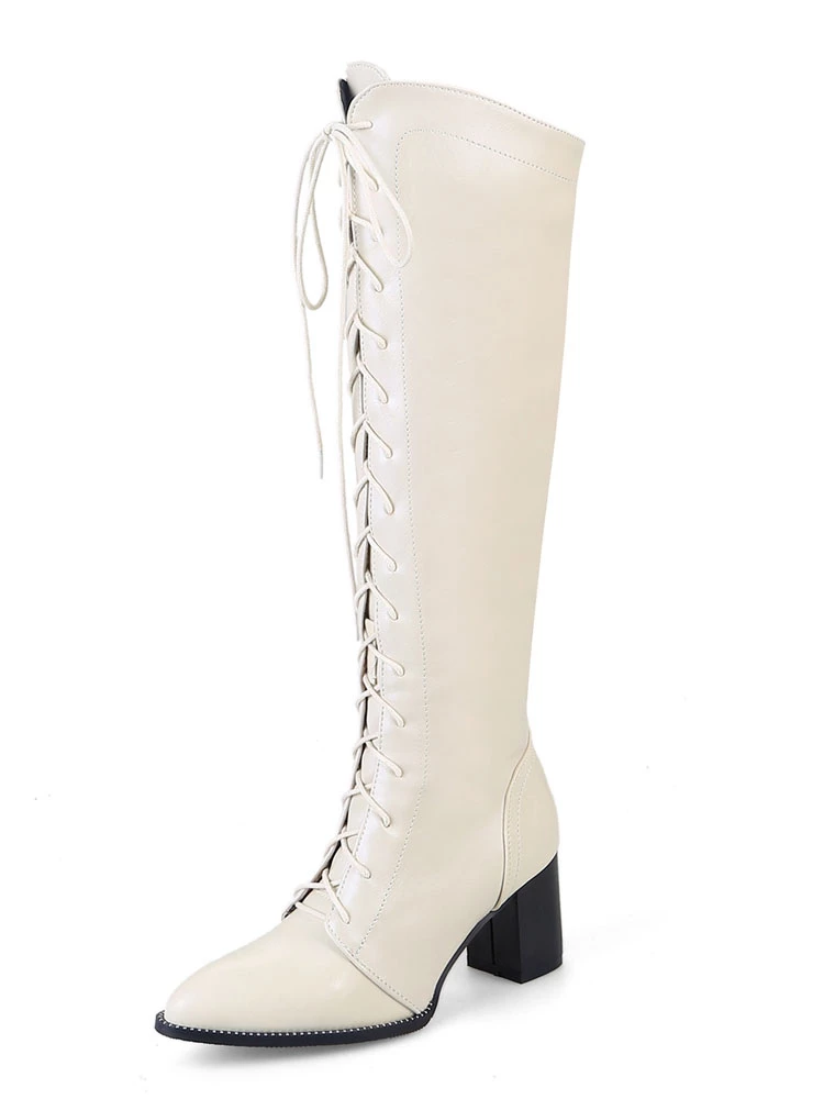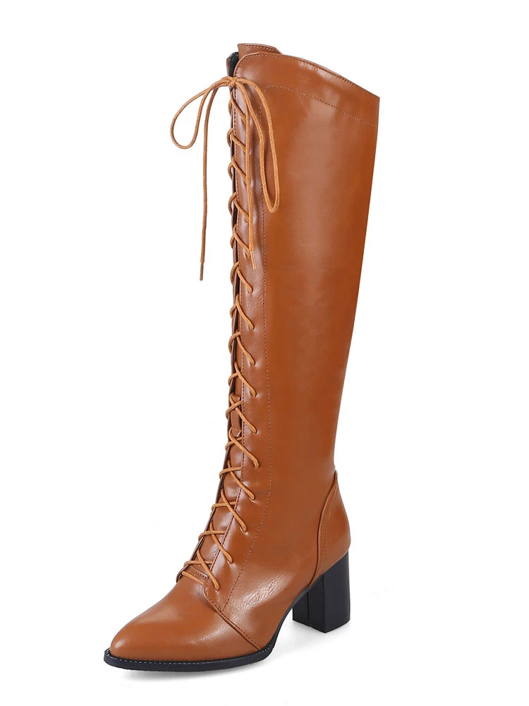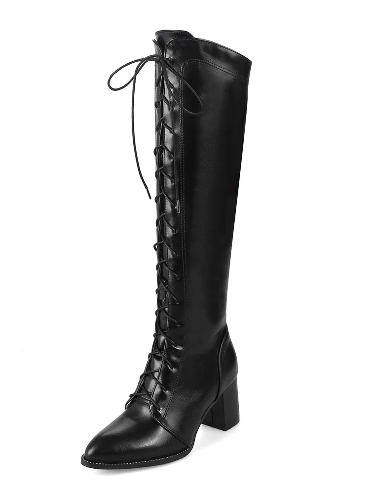 Knee High Boots Womens Solid Color Lace Up Pointed Toe Chunky Heel Boots