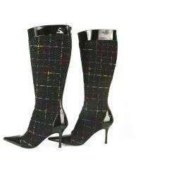 Gina Tweed Fabric Black Patent Leather Boots Slim Heels Shoes Back Zipper Sz 6