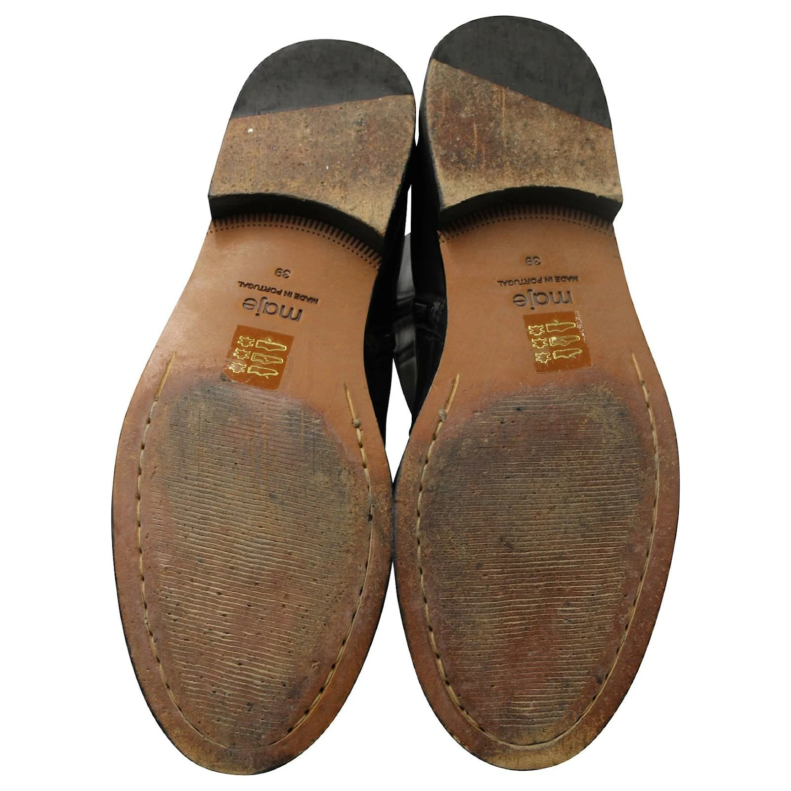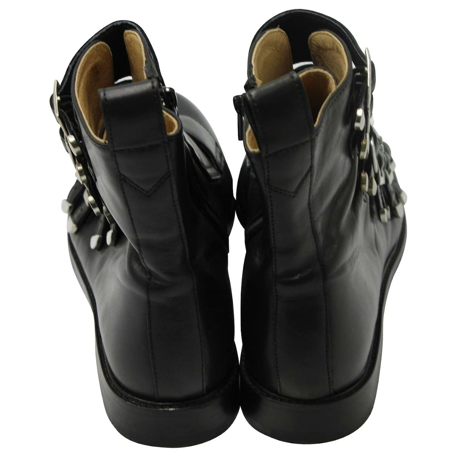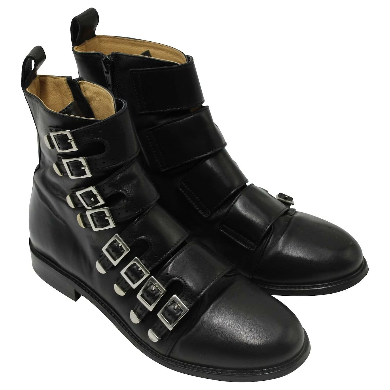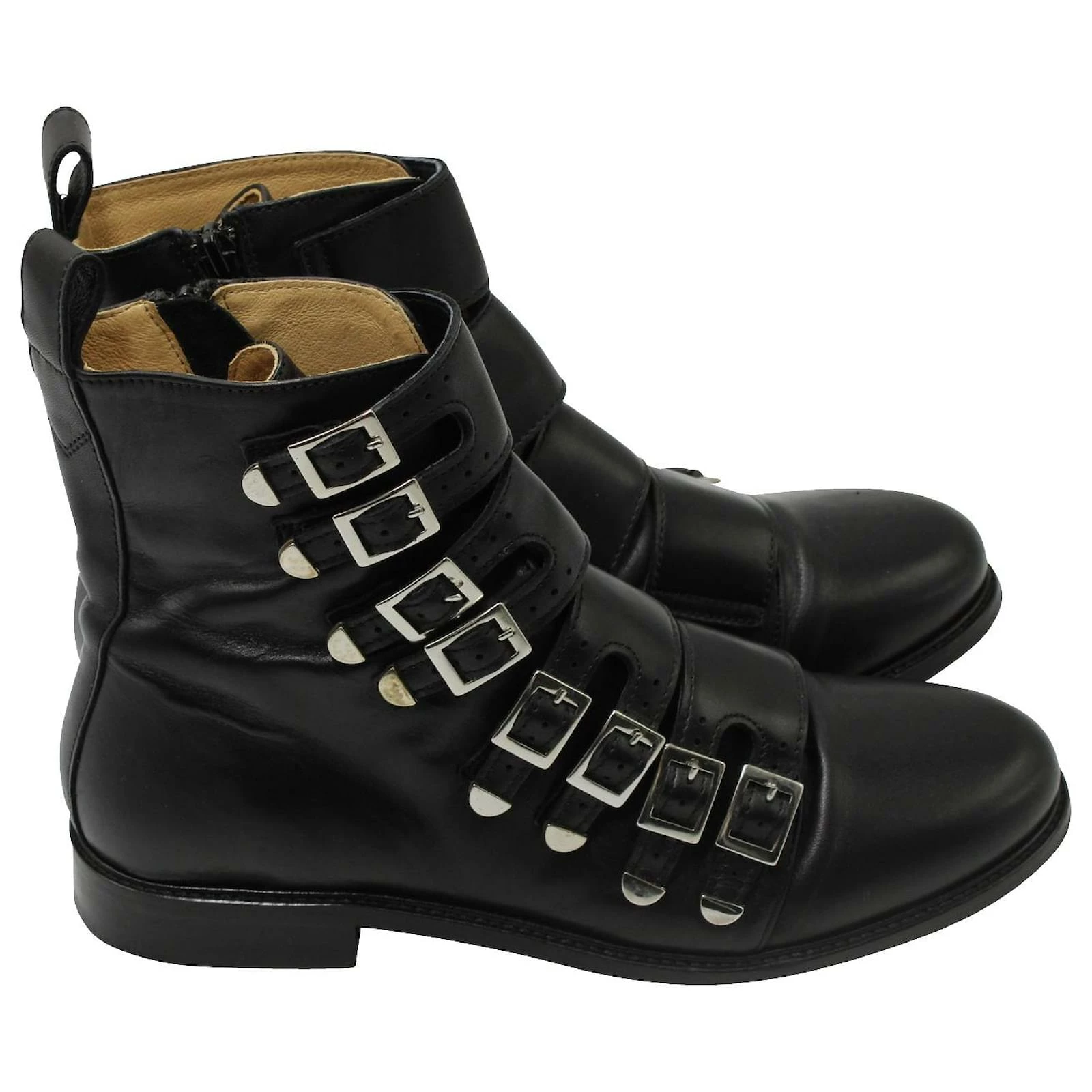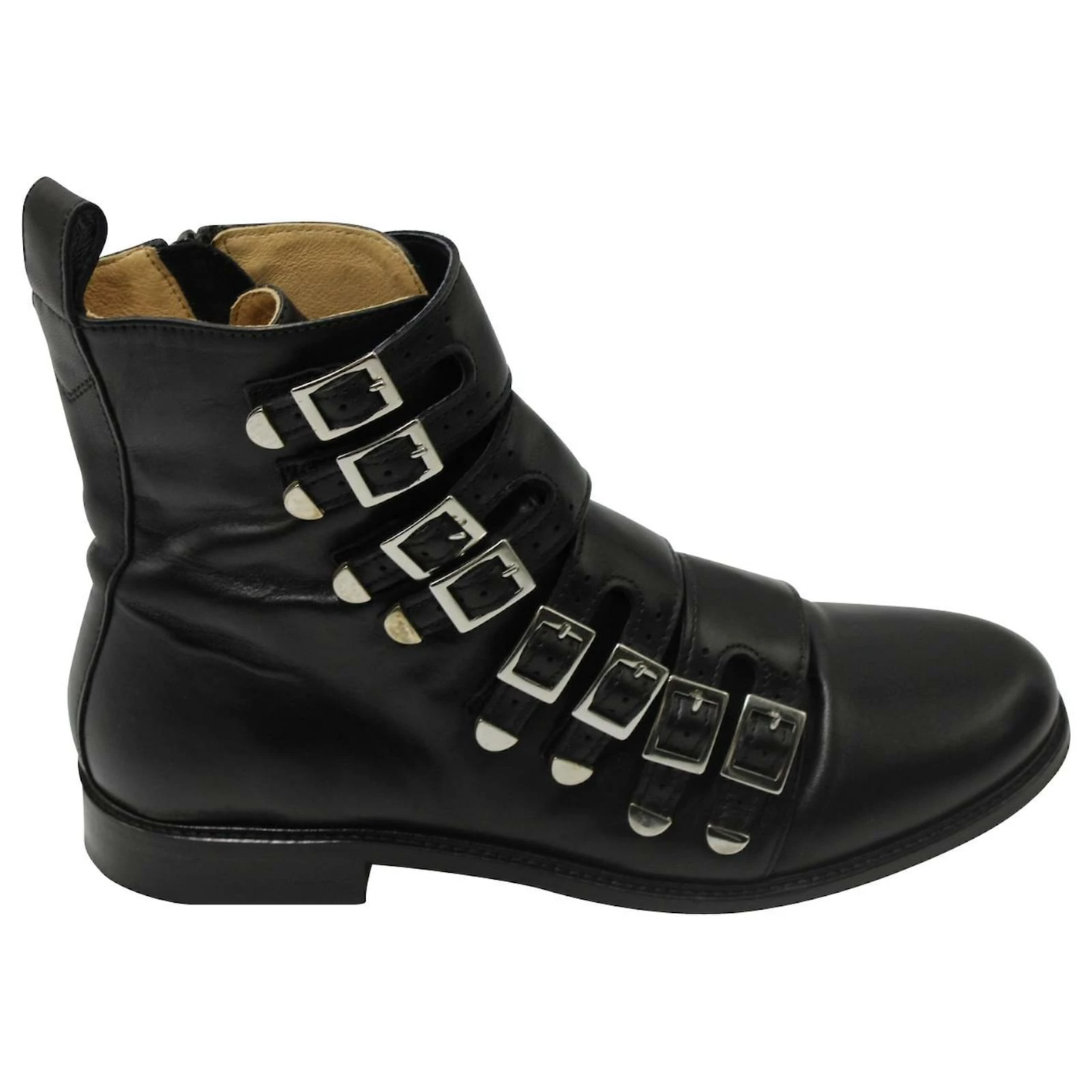 Maje showcases this edgy ankle boots. It is deigned with polished leather, round toe and multiple strap detailing with buckle details. Wear this boots with a sundress for a rocker vibe aesthetic with a feminine touch.