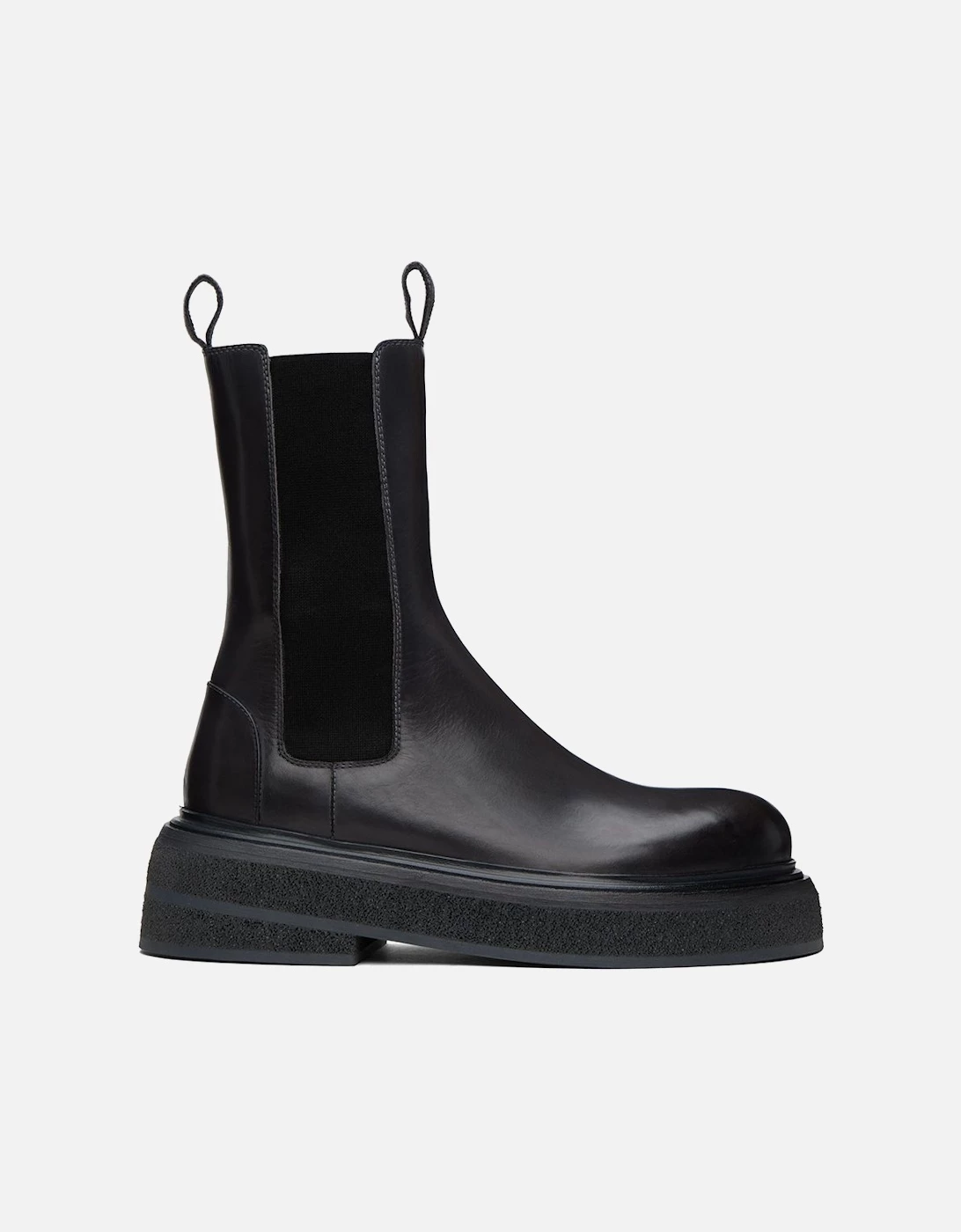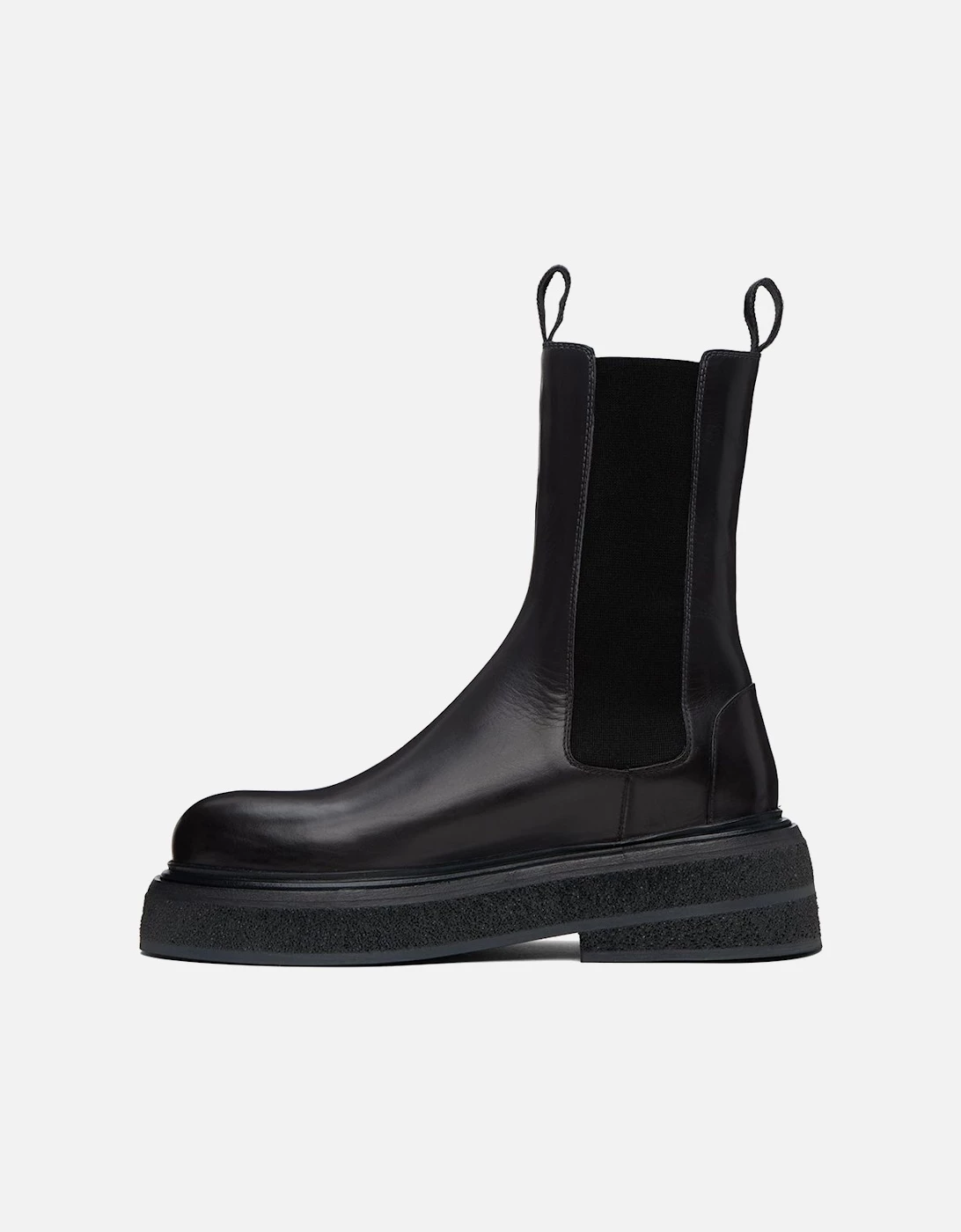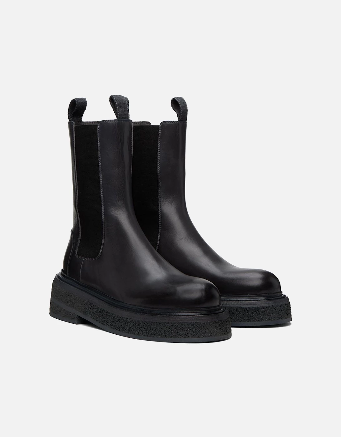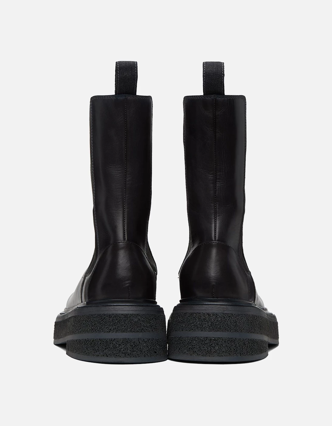 Calf-high buffed leather Chelsea boots in gray. 路 Webbing pull-loops at collar 路 Elasticized gusset at sides 路 Grained leather lining 路 Stacked leather and foam rubber platform midsole 路 Treaded microporous rubber outsole 路 Platform: H1.5 in 路 Heel: H2.25 in Supplier color: Lead