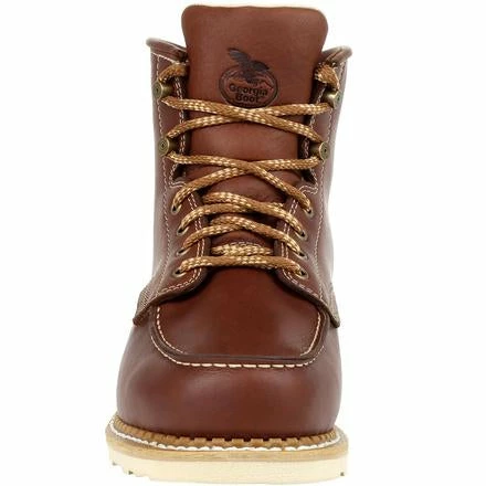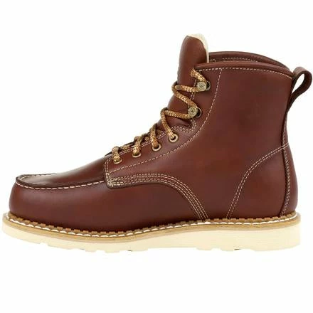 Built with a durable Goodyear welt construction, this Georgia Boot USA 6″ wedge work boot features a moc toe and is crafted with premium SPR leather, milled brass hardware, a padded pig lined tongue, and a rear pull tab for easy pull on.