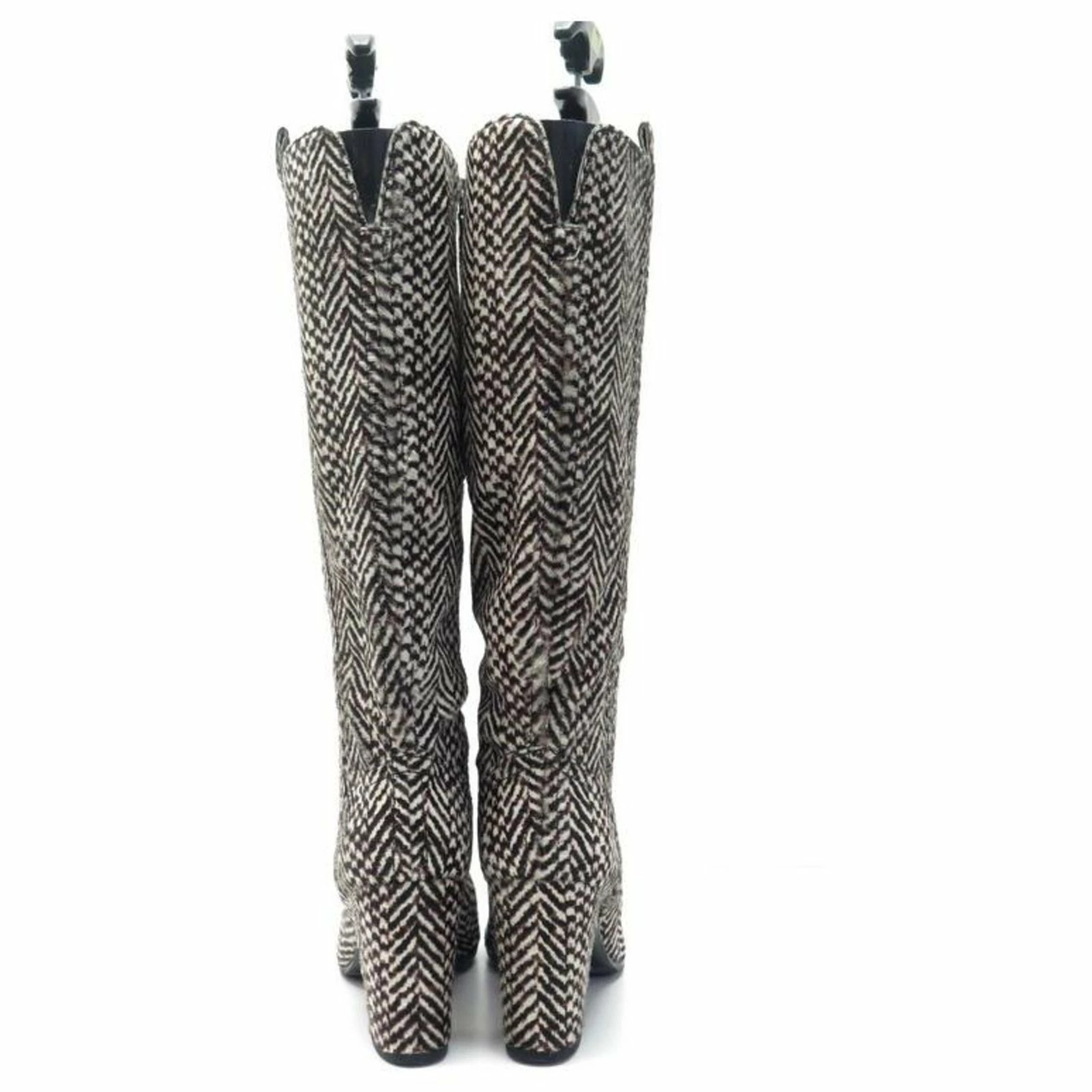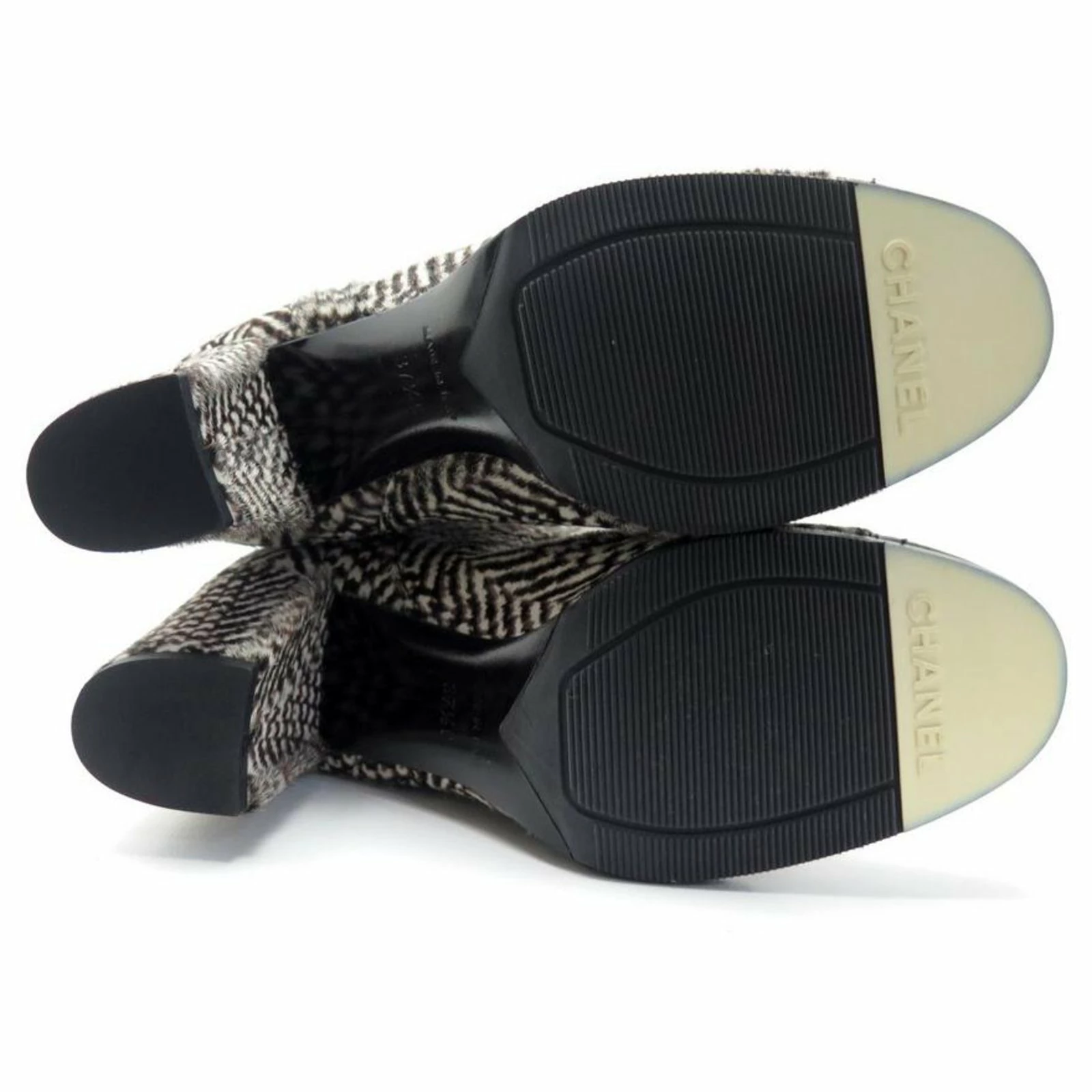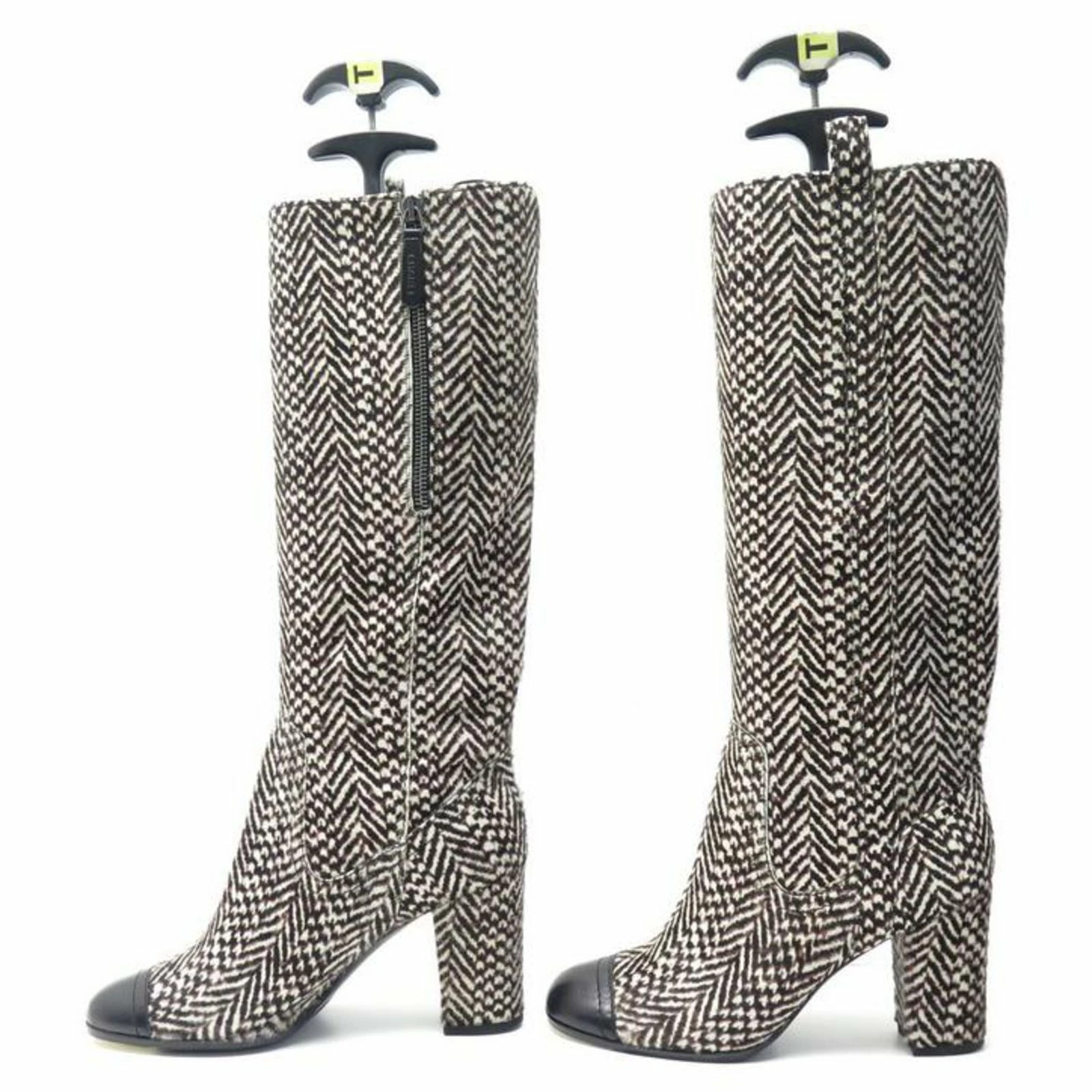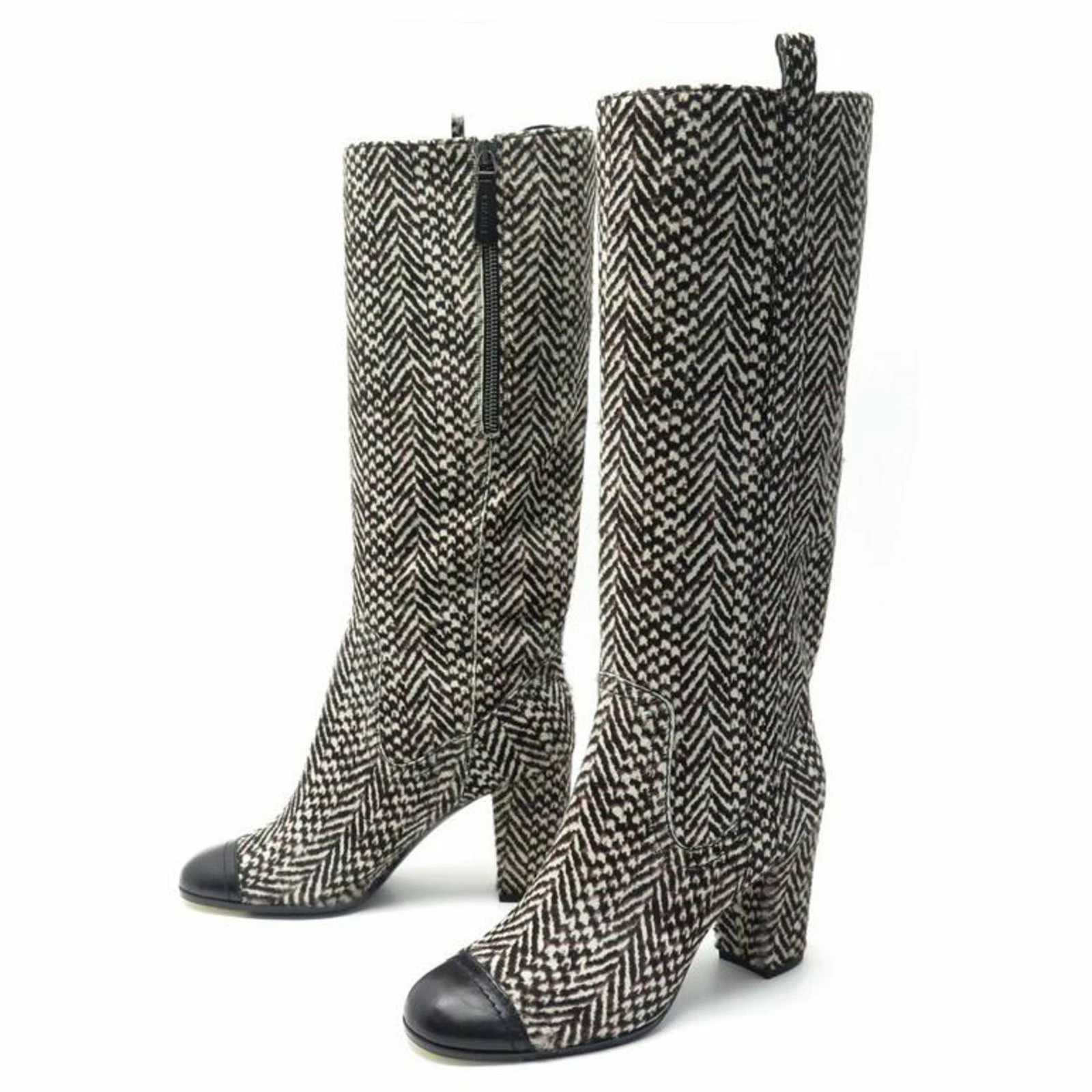 Boot type shoesBrand: CHANELModel: CAVALIERES POILS MOTIFS TWEEDManufacturer reference: G26922Shoe type: Heels Year of manufacture: 2009Gender: Female New value: 1200 eurosList of documents and supplied accessories: BoxPochonCARACTERISTICS: Material: foal leatherColor: Brown Note: from Staff sales / private salesSize: 37.5heel height (in cm) : 08Dimensions: Length of the outer sole (cm): 27.5Max sole width (cm): 8calf circumference (cm): 32Opening tour (cm): 36Total height of the boot heel included (cm): 43