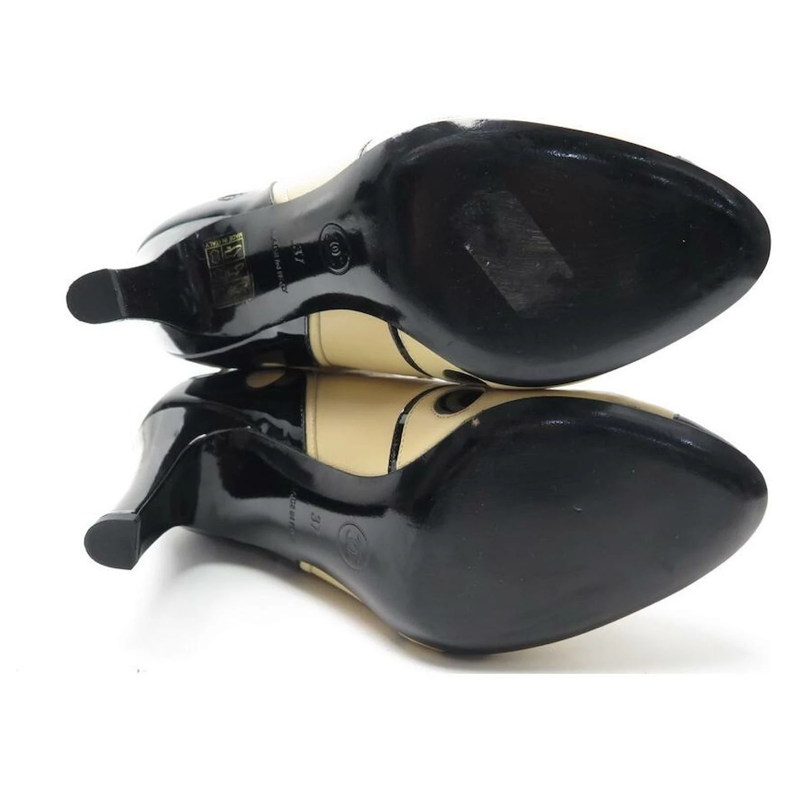 To note : two-tone: beige leather and black patent leather