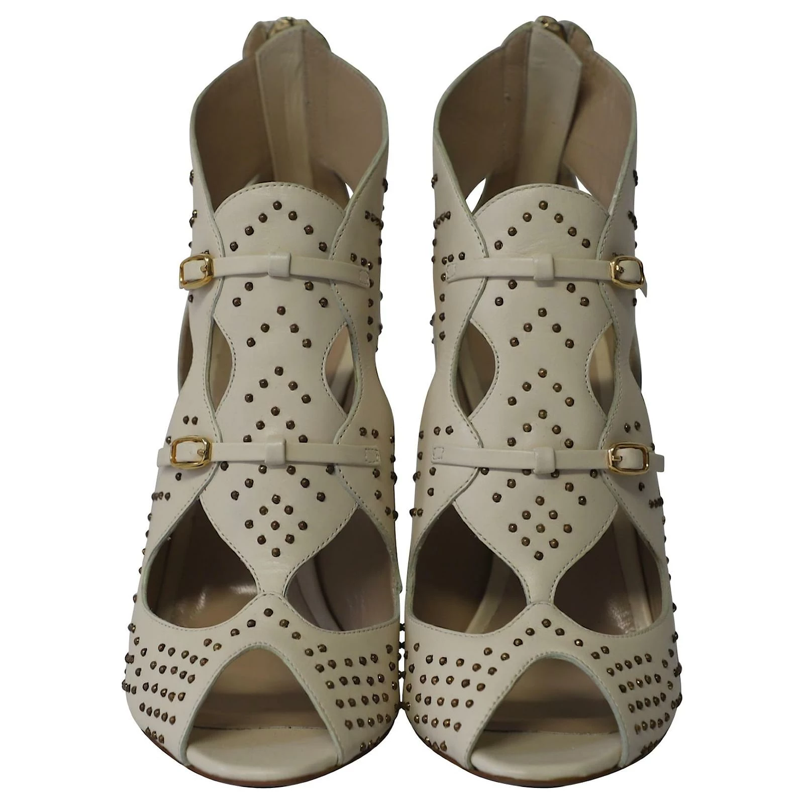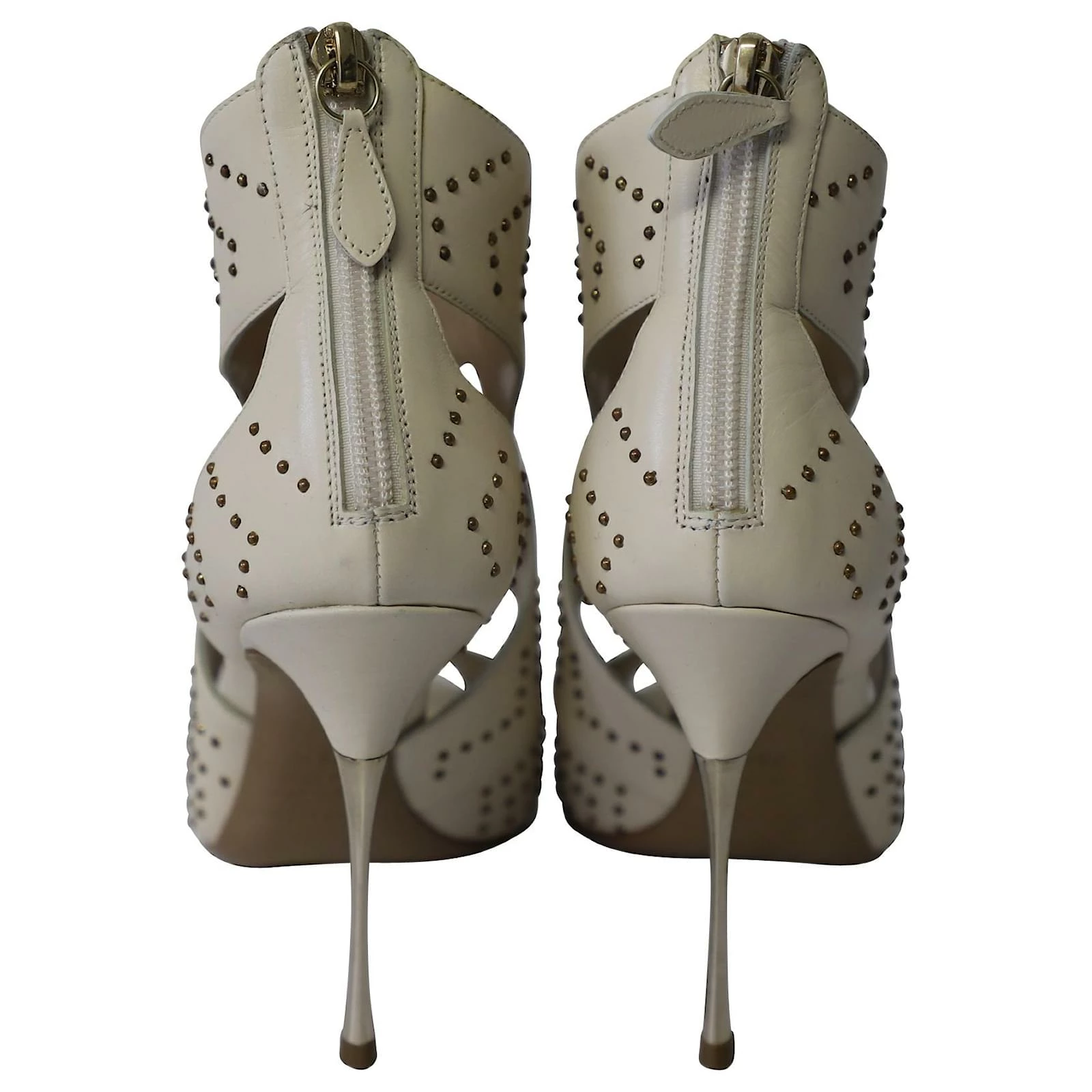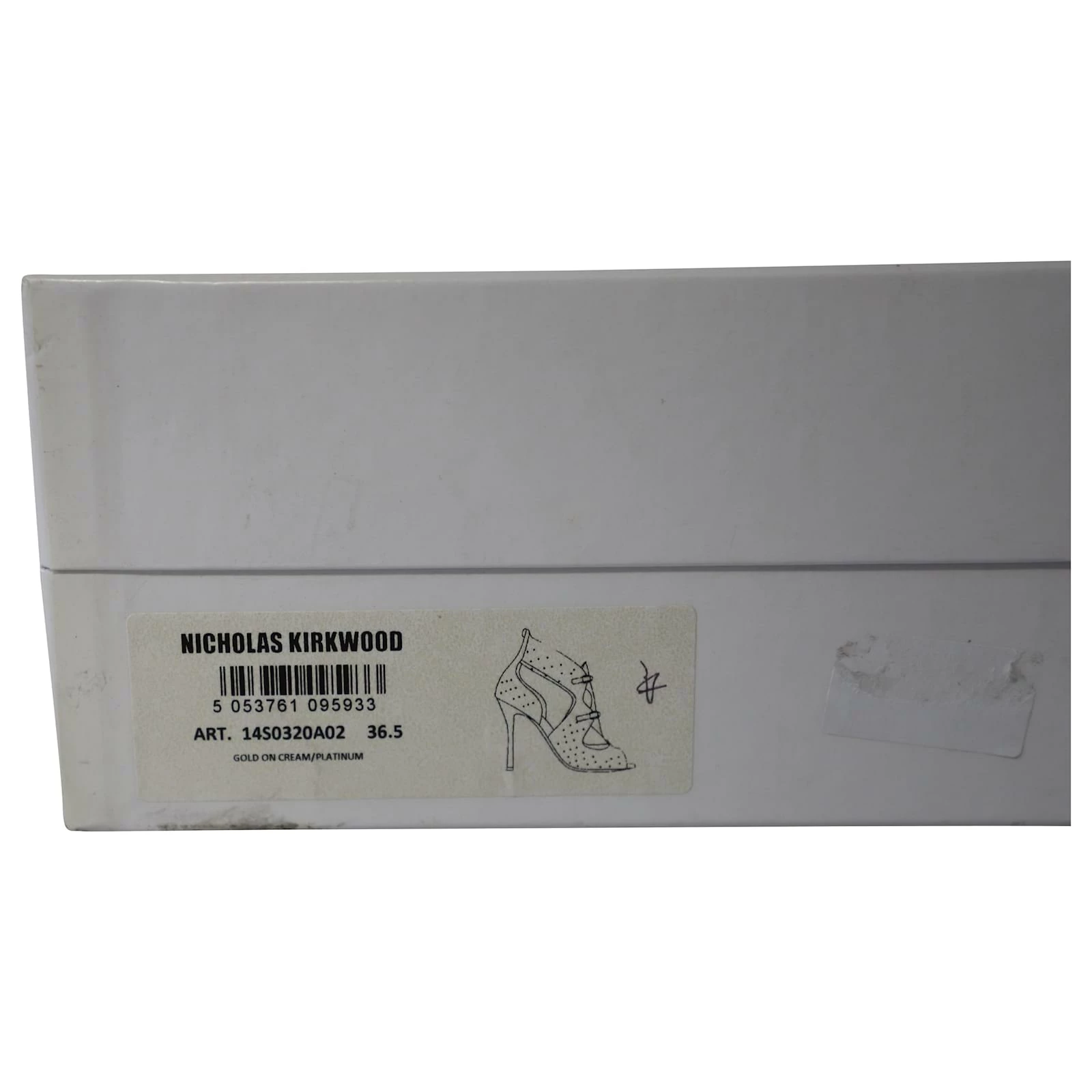 This Nicholas Kirkwood ankle boots is designed in an exciting fashion. With notable cutout design, this refreshing cream pair is high on style and signature elements. The pair is rendered in leather and is furnished with open toes, buckled straps on the vamps, zipper fastenings on the counters, and towering stiletto heels.