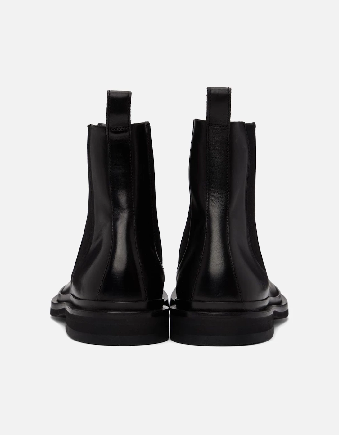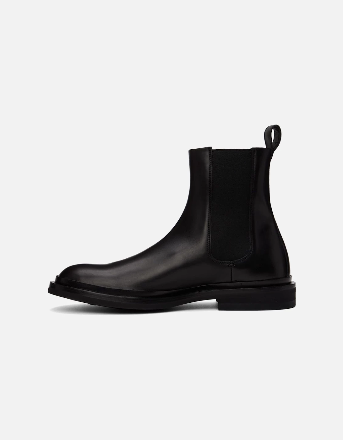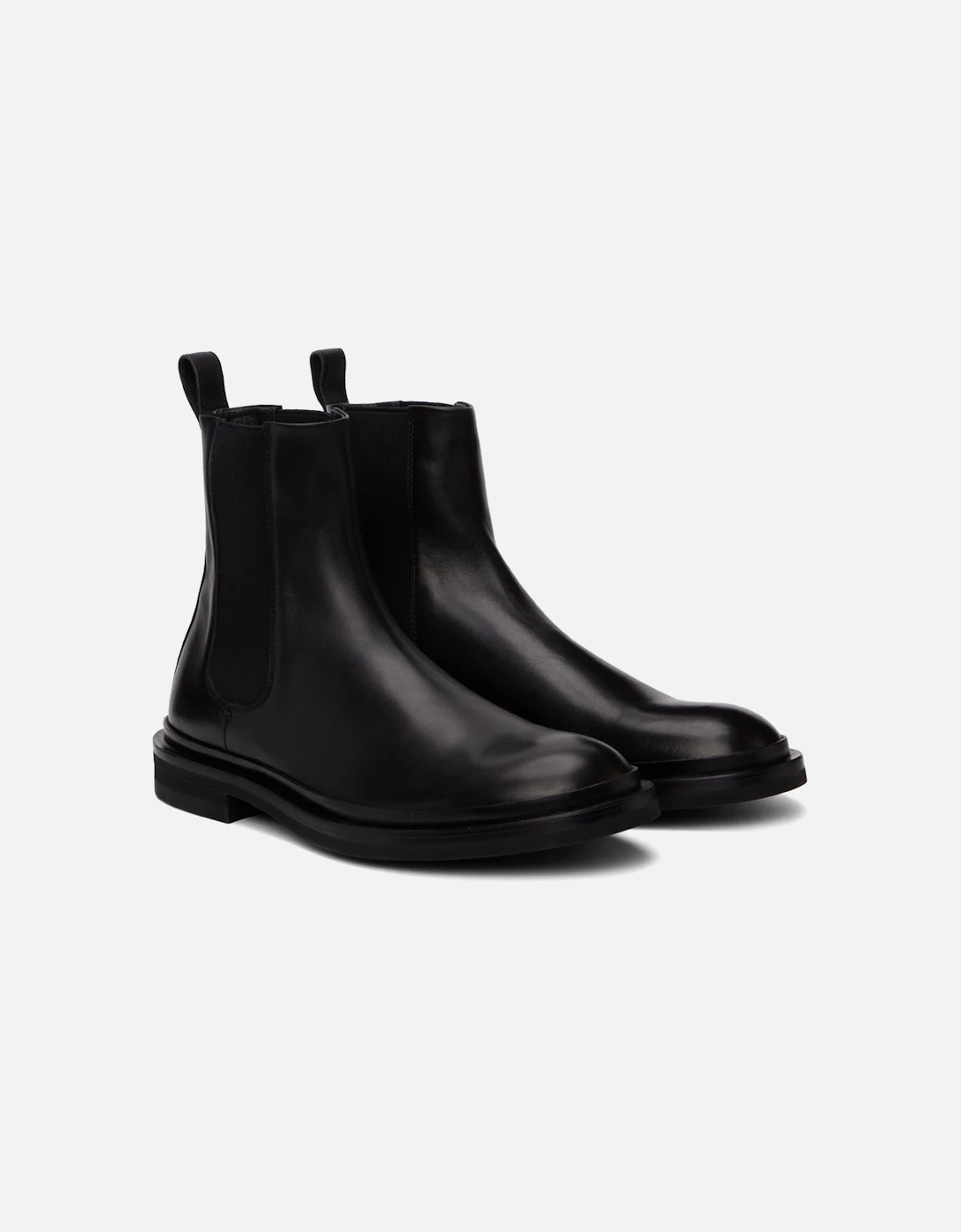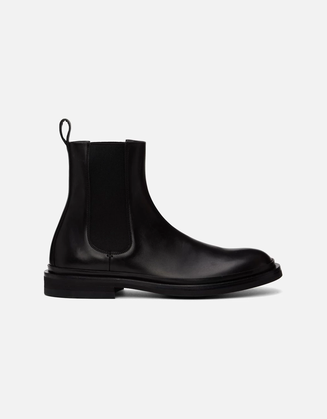 Handcrafted ankle-high buffed leather Chelsea boots in black. 路 Almond toe 路 Elasticized gusset at sides 路 Pull-loop at heel collar 路 Stacked foam rubber midsole 路 Treaded Vibram庐 rubber sole Supplier color: Buttero nero